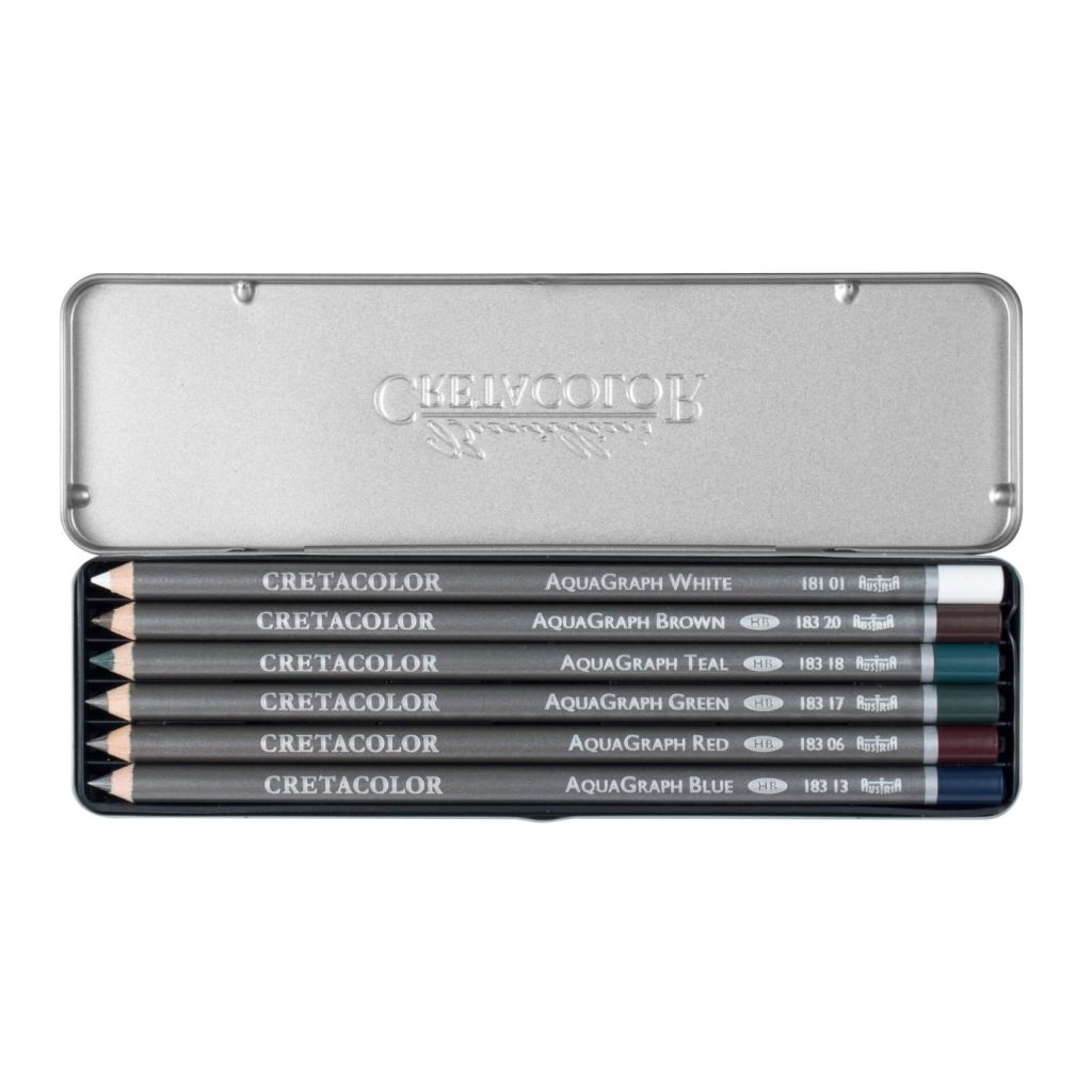 Набор графитовых с оттенками разных цветов. Карандаши могут использоваться как для классических художественных работ в графических техниках, так и для смешанных техник или работ с акварелью. Карандаши легко размываются водой, создавая акварельные эффекты, особенно удобны для прорисовки деталей в акварельных работах. В наборе 6 карандашей Aqua Graph красного, синего, зеленого бензинового, коричневого и белого цветов.