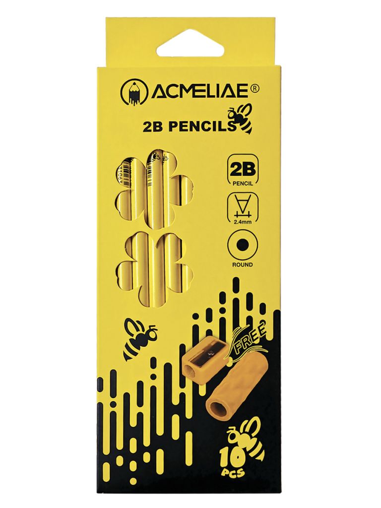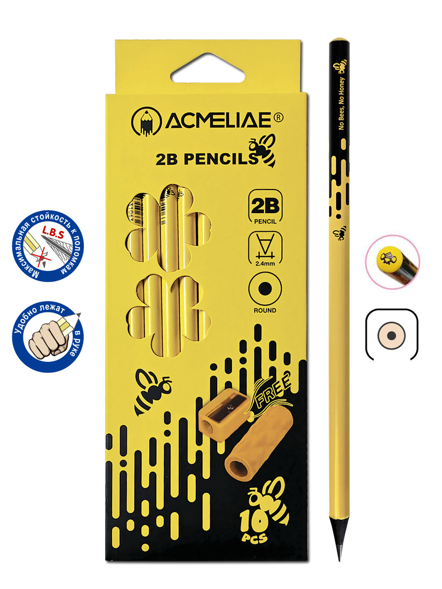 В наборе 10 высококачественных чернографитных карандашей твердостью 2В с держателем-ластиком и точилкой. Эргономичный круглый корпус карандаша выполнен из тополя, легко затачивается и не крошится в процессе заточки. Грифель карандаша проклеен по всей длине и устойчив к поломкам. Функциональный держатель можно использовать в качестве удлинителя или ластика.