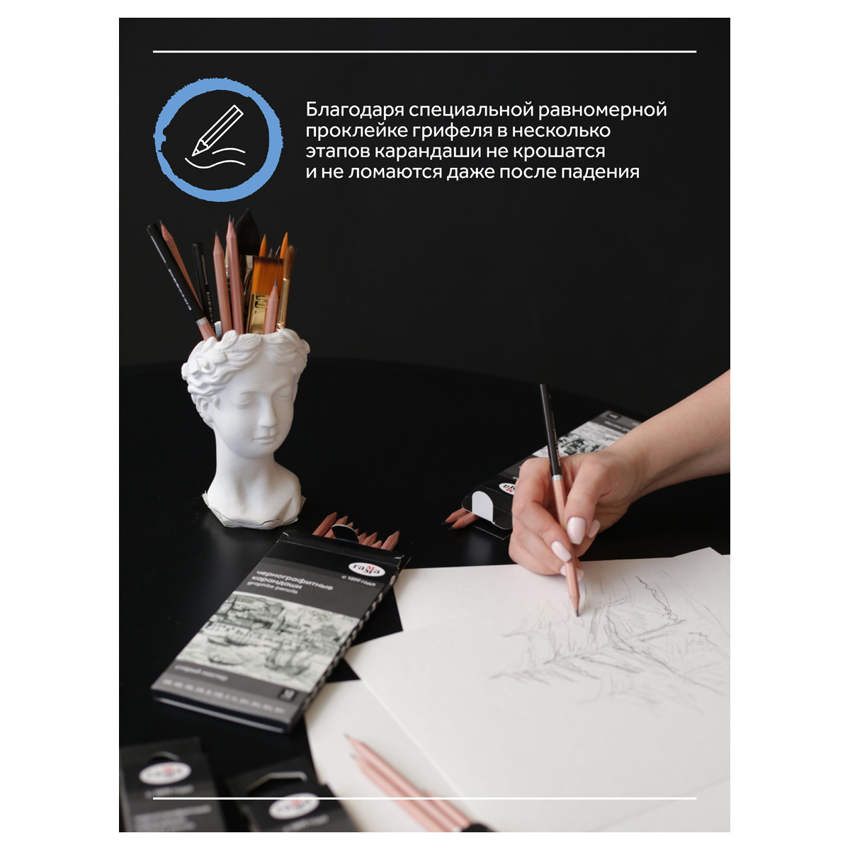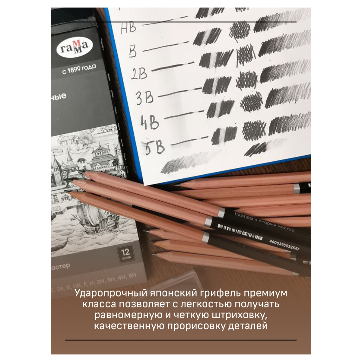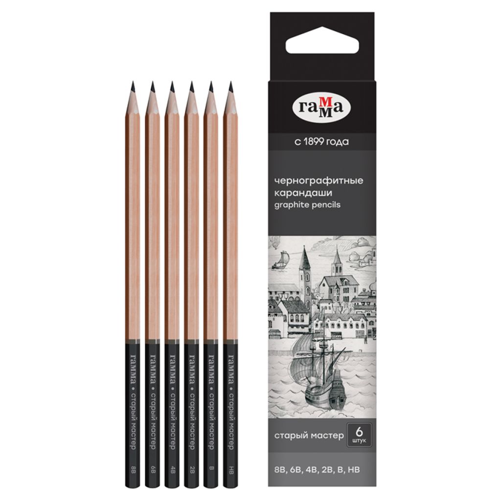 Набор чернографитных карандашей ГАММА предназначен для рисования, скетчинга и детальных прорисовок. В карандашах ГАММА используется японский грифель премиум-класса, который позволяет с легкостью получать равномерную и четкую штриховку, качественную прорисовку деталей. Разные степени твердости помогают с легкостью передать темные, средние и светлые тона, варьировать толщину линии. Благодаря специальной равномерной проклейке грифеля в несколько этапов карандаши не крошатся и не ломаются даже после падения. Карандаши ГАММА изготовлены из высококачественной натуральной древесины кедра. Кедр – это мягкая, но прочная древесина, долговечная и водонепроницаемая. Благодаря этому карандаши затачиваются легко без зазубрин и заноз. Карандаши эргономичной шестигранной формы с приятным матовым покрытием комфортно держать в руке. В набор входят 6 чернографитных карандашей: 8B, 6B, 4B, 2B, B, HB.