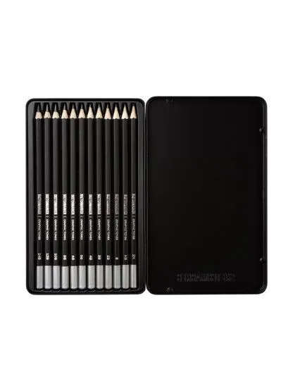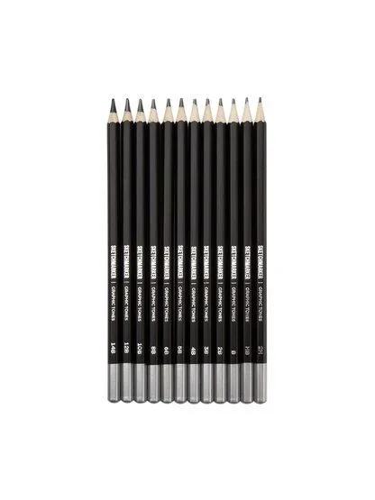 Чернографитные карандаши Sketchmarker Graphic Tones идеально подходят художникам, дизайнерам и иллюстраторам любого уровня подготовки. В наборе представлен широкий диапазон степеней твёрдости чернографитных карандашей, подходящих для чётких, тонко проработанных иллюстраций, проектов, чертежей, тоновых рисунков и эскизов разной степени детализации. Состав набора: 2H, HB, B, 2B, 3B, 4B, 5B, 6B, 8B, 10B, 12B, 14B. Чернографитные карандаши изготовлены из высококачественного графита и очищенной глины. Шестигранный корпус эргономично лежит в руке художника и обеспечивает комфорт как при выполнении быстрых зарисовок, так и при длительном рисовании. Карандаши, в зависимости от твёрдости, имеют различный диаметр грифеля — это обеспечивает равномерный расход грифелей у карандашей разной мягкости и даёт дополнительные художественные возможности: широкие штрихи самых мягких карандашей в наборе и точная, детализированная проработка — более твёрдыми. Диаметр грифелей: 2H – 2,2 мм, HB – 2,15 мм, B – 2,2 мм, 2B – 2,2 мм, 3B и 4B – 2,40–2,45 мм, 5B и 6B – 3,0 мм, 8B – 3,3 мм, 10B, 12B, 14B – 4,0 мм. Карандаш 14B имеет самый чёрный цвет из всех карандашей, представленных в наборе, и незначительную матовость линии. С его помощью можно добиться непревзойдённого контраста в рисунке. Корпус карандаша выполнен из мягкой древесины липы, обеспечивающей лёгкое затачивание. Грифель проклеен по всей длине, благодаря чему карандаш не ломается при заточке, даже после падения. Графит легко стирается с бумаги ластиком или клячкой, что обеспечивает возможность вносить правки в рисунок.