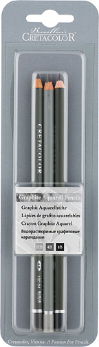 Водорастворимые чернографитные карандаши CRETACOLOR Graphite Aquarelle профессионального качества. Карандашами можно работать как в сухой технике, так и с использованием кисти и воды. Такие карандаши удобны в работе с красками на водной основе, часто применяются для создания набросков в акварельных работах. В наборе 3 карандаша разной степени твердости: HB,4B,8B.
