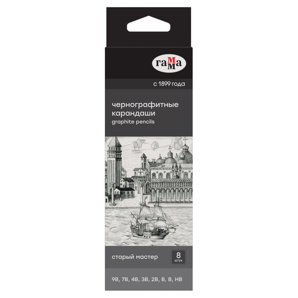 Набор чернографитных карандашей ГАММА серии «Старый мастер» предназначен для рисования, скетчинга и детальных прорисовок. В набор входят 8 чернографитных карандашей: 9B, 7B, 4B, 3B, 2B, B, B, HB. Они идеально подойдут как для художников, иллюстраторов, так и для архитекторов и инженеров. В карандашах используется японский грифель премиум-класса, который позволяет с легкостью получать равномерную и четкую штриховку, качественную прорисовку деталей. Разные степени твердости помогают с легкостью передать темные, средние и светлые тона, варьировать толщину линии. Благодаря специальной равномерной проклейке грифеля в несколько этапов карандаши не крошатся и не ломаются даже после падения. Карандаши изготовлены из высококачественной натуральной древесины кедра. Это мягкая, но прочная древесина, долговечная и водонепроницаемая. Благодаря этому карандаши затачиваются легко без зазубрин и заноз. Корпус эргономичной шестигранной формы с приятным матовым покрытием комфортно держать в руке. Длина корпуса – 177 мм, а диаметр – 7 мм.