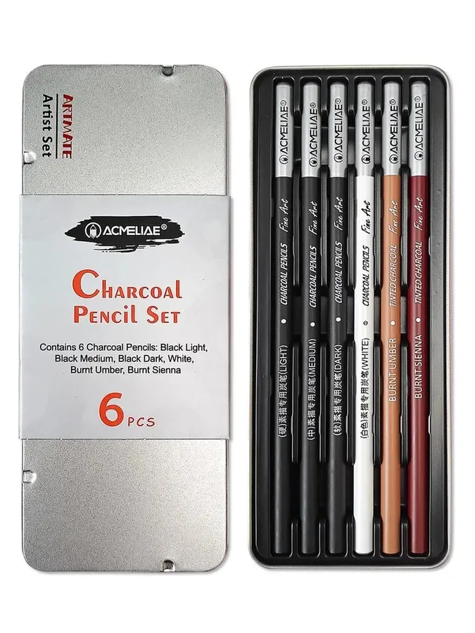 Набор высококачественных художественных угольных карандашей 6 штук: черный уголь 3 шт, белый уголь – 1 шт, жженая умбра – 1шт, жженая сиена – 1шт. Металлический футляр. Универсальны в рисовании, обладают огромными возможностями в передаче света и тени. Удобны для проработки контуров и мелких деталей, скетчинга, эскизов, набросков, графики, портретов, живописи. Три черных угольных карандаша Light, Medium, Dark разной степени твердости и насыщенности. Белый уголь для рисования сочетает лучшие характеристики угля и простых карандашей для творчества. Используются для смягчения и осветления основного цвета, создания монохромных рисунков, придания объема предметам за счет бликов, создания плавных цветовых переходов с помощью растушевки цвета. Помогает прорисовать светлые места, уменьшить насыщенность базовых цветов. Отлично смотрятся на темном фоне. Легко удаляется с бумаги ластиком. Темно-коричневый уголь идеален для создания монохромных рисунков, создания цветовых переходов, анималистики, прорисовки лиц. Затачивается канцелярским ножом. Не пачкает руки. Длина: 175 мм. Форма корпуса: круглая. Корпус из натуральной древесины.
