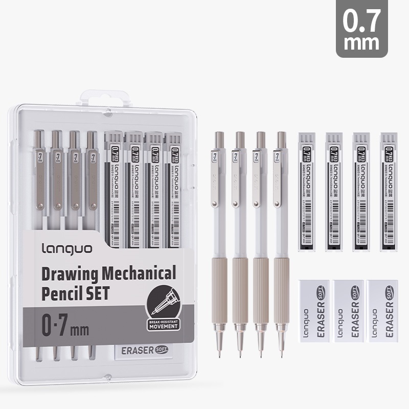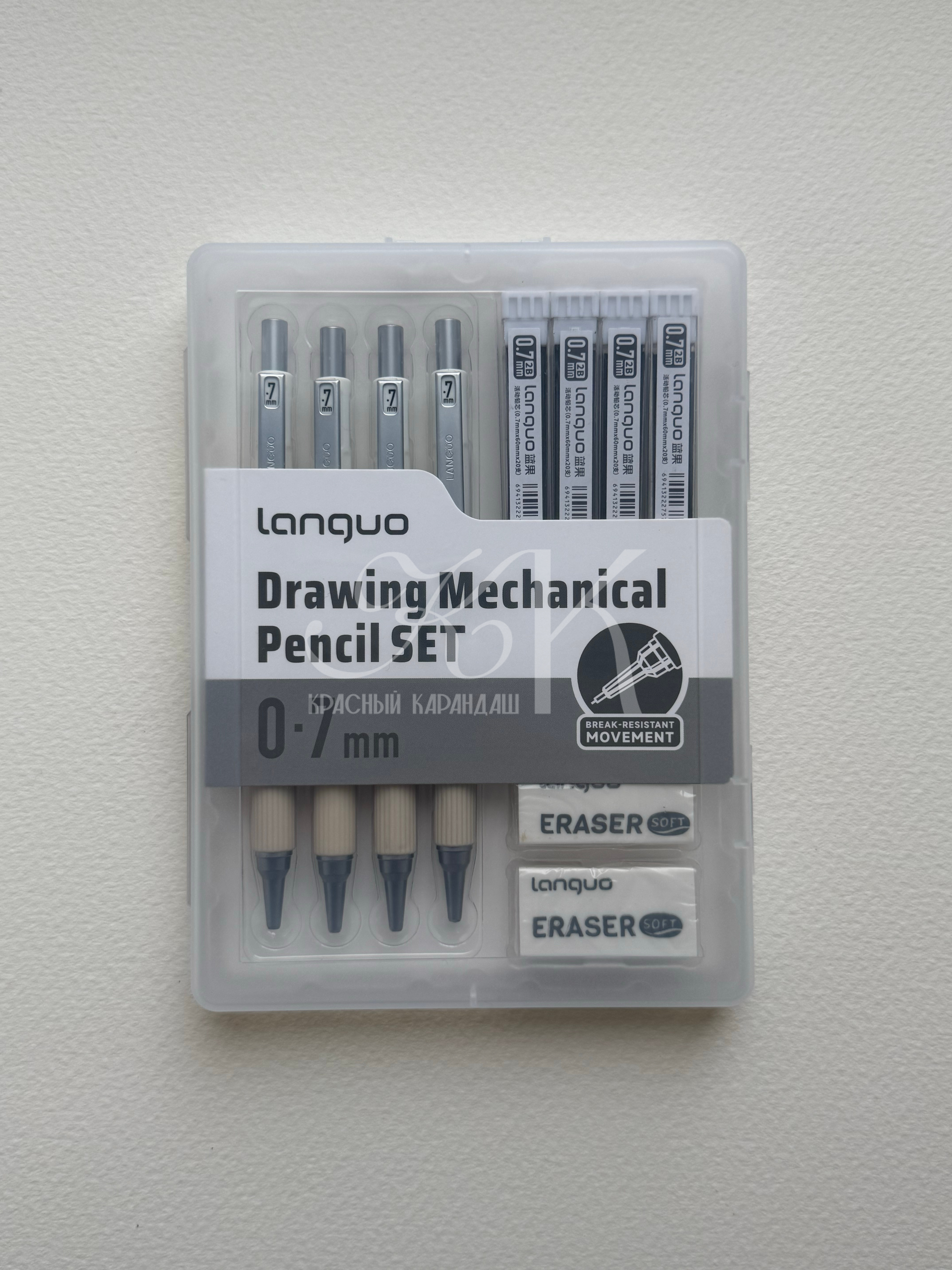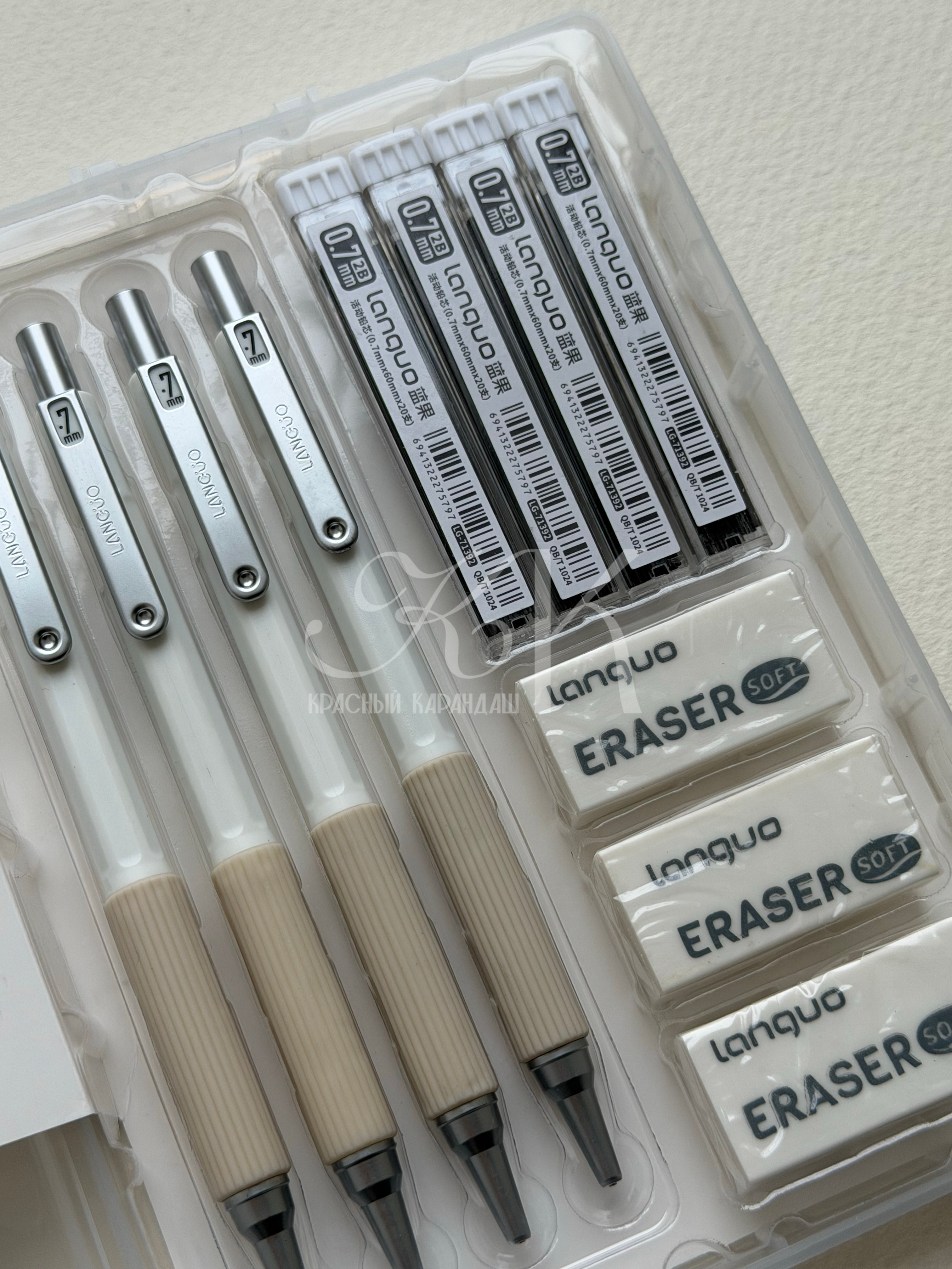 Карандаш механический Languo отличается элегантным дизайном. Пластиковый фигурный корпус с резиновым держателем и металлическим наконечником. Подача грифеля осуществляется с помощью кнопочного механизма, под корпусом кнопки расположен небольшой ластик.