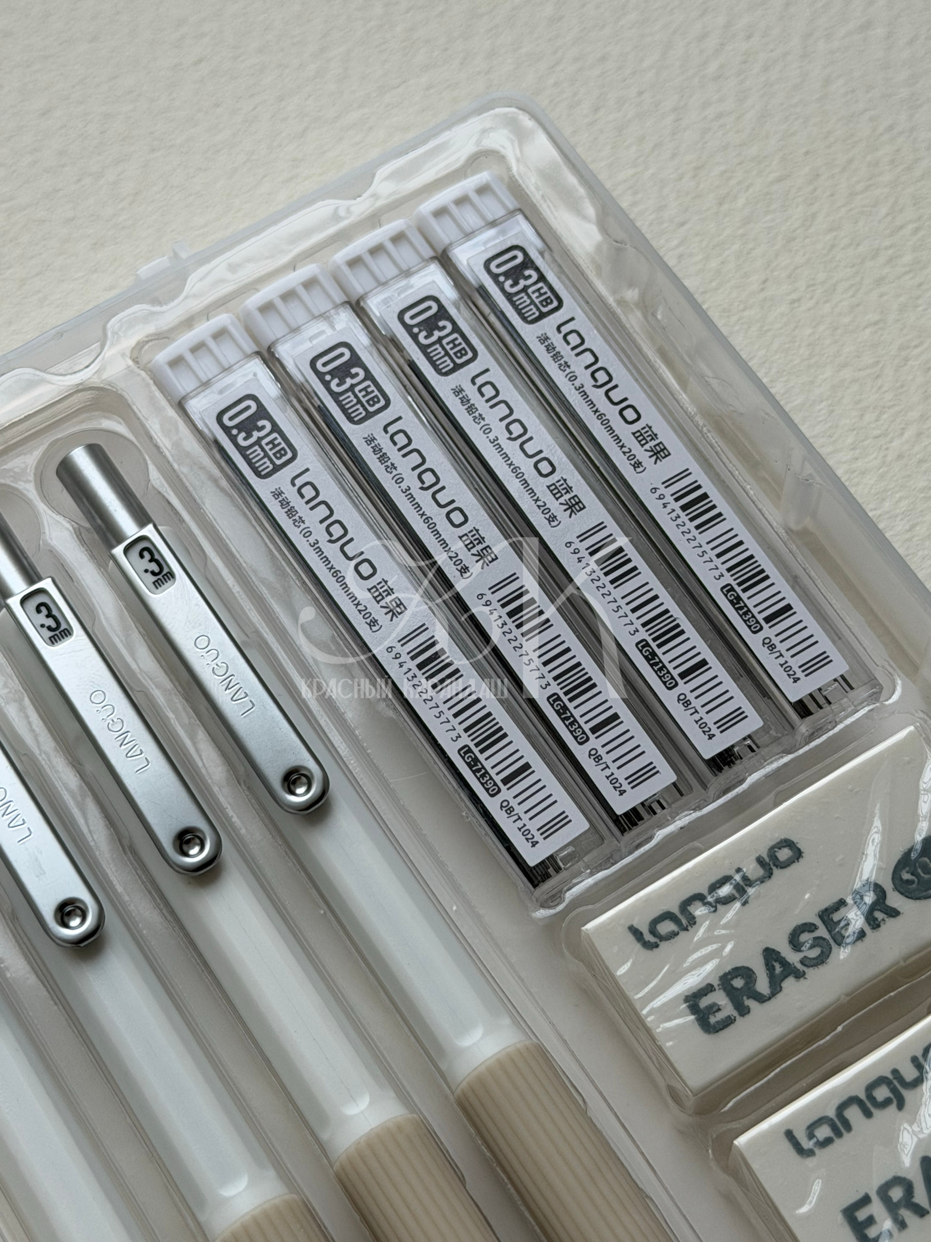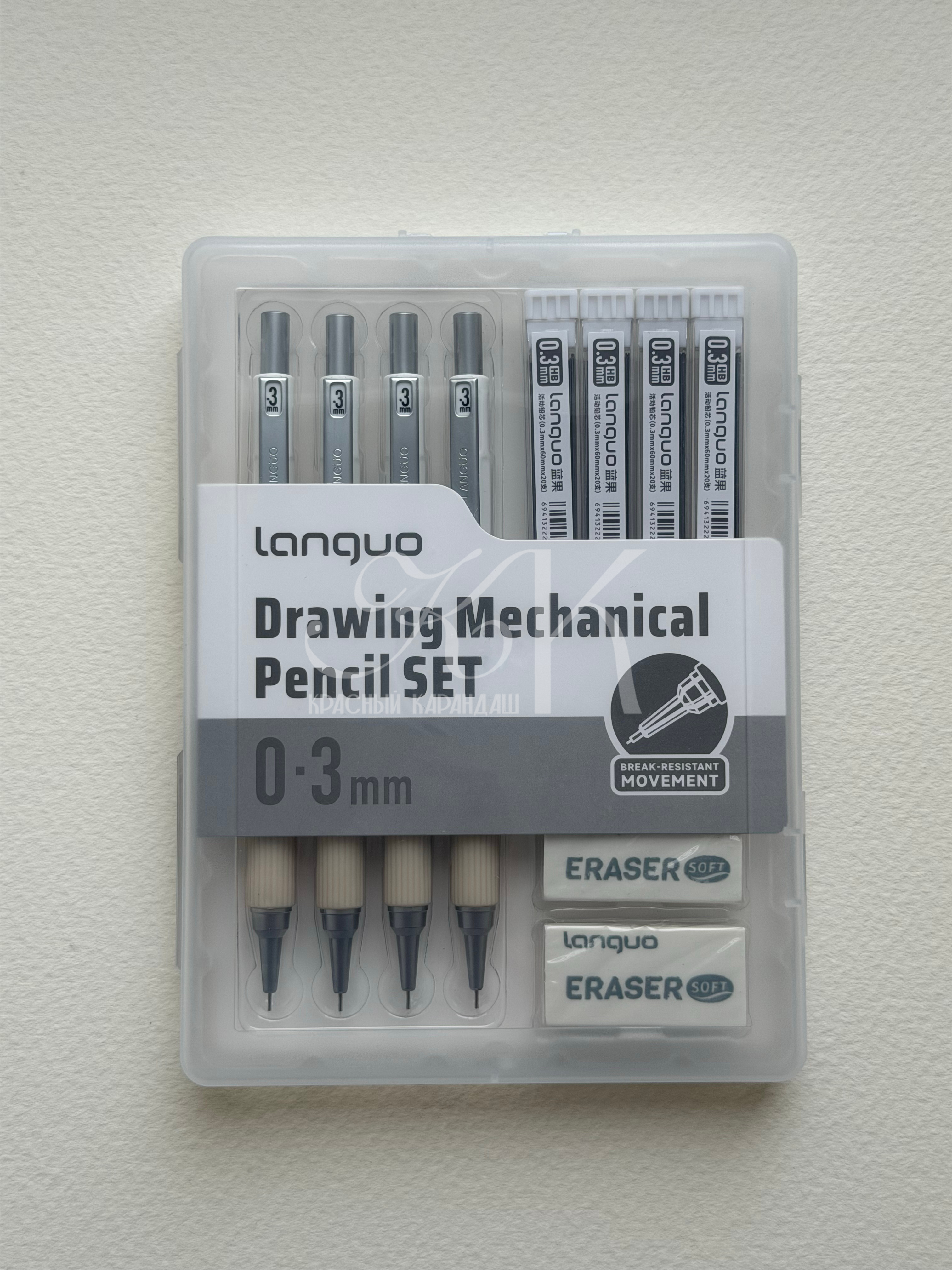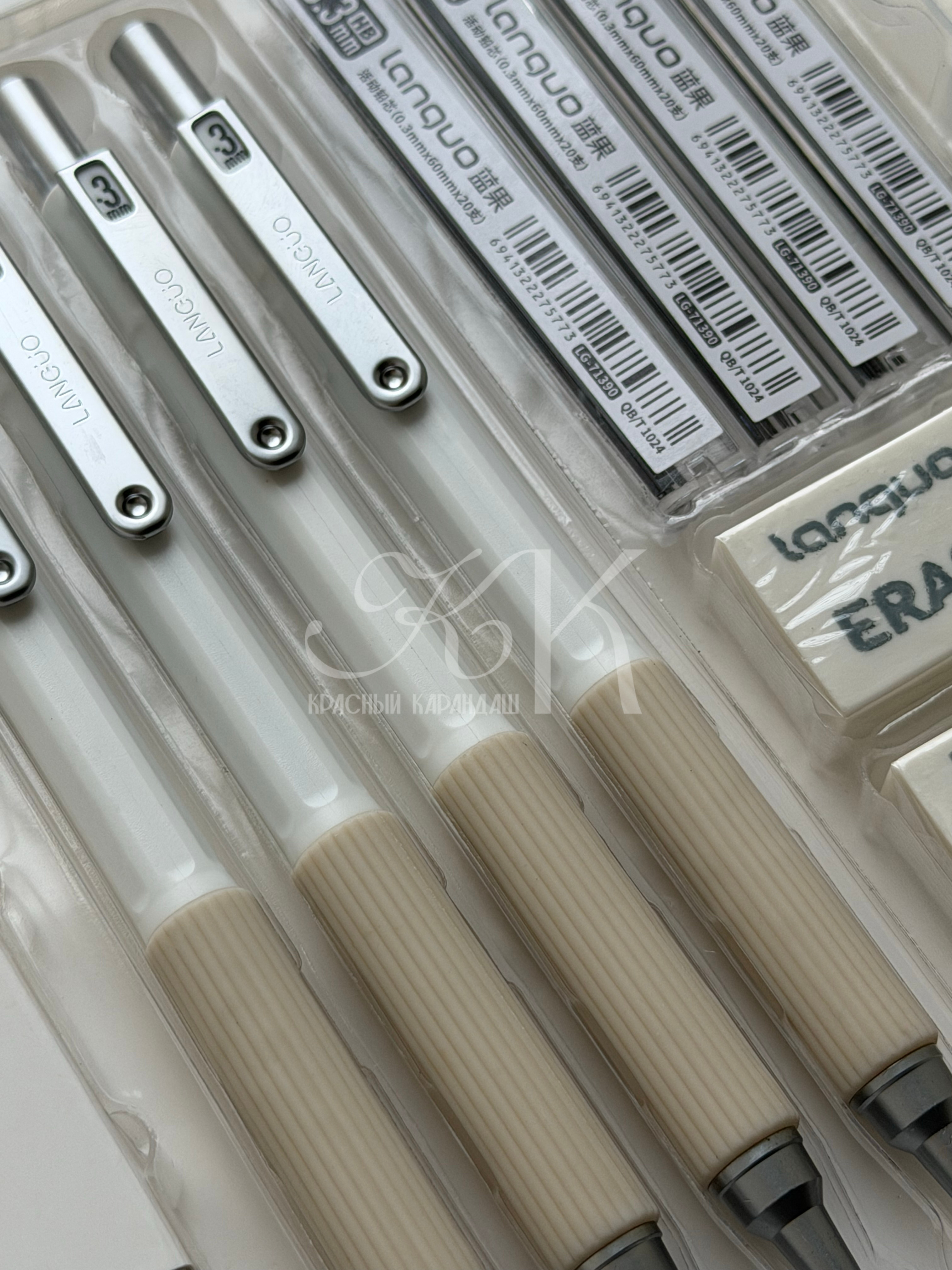 Карандаш механический Languo отличается элегантным дизайном. Пластиковый фигурный корпус с резиновым держателем и металлическим наконечником. Подача грифеля осуществляется с помощью кнопочного механизма, под корпусом кнопки расположен небольшой ластик.
