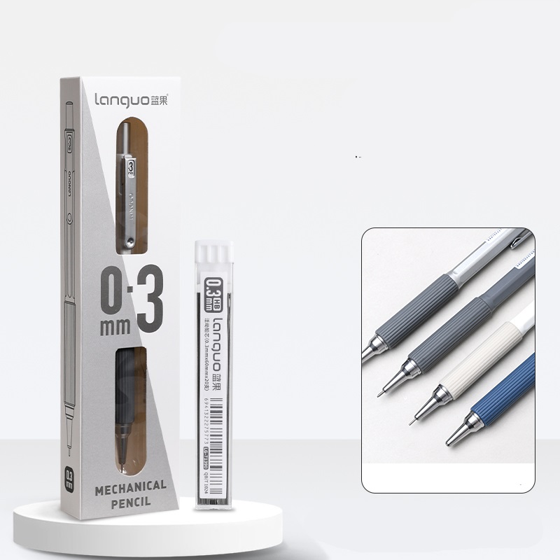 Карандаш механический Languo отличается элегантным дизайном. Пластиковый фигурный корпус с резиновым держателем и металлическим наконечником. Подача грифеля осуществляется с помощью кнопочного механизма, под корпусом кнопки расположен небольшой ластик.