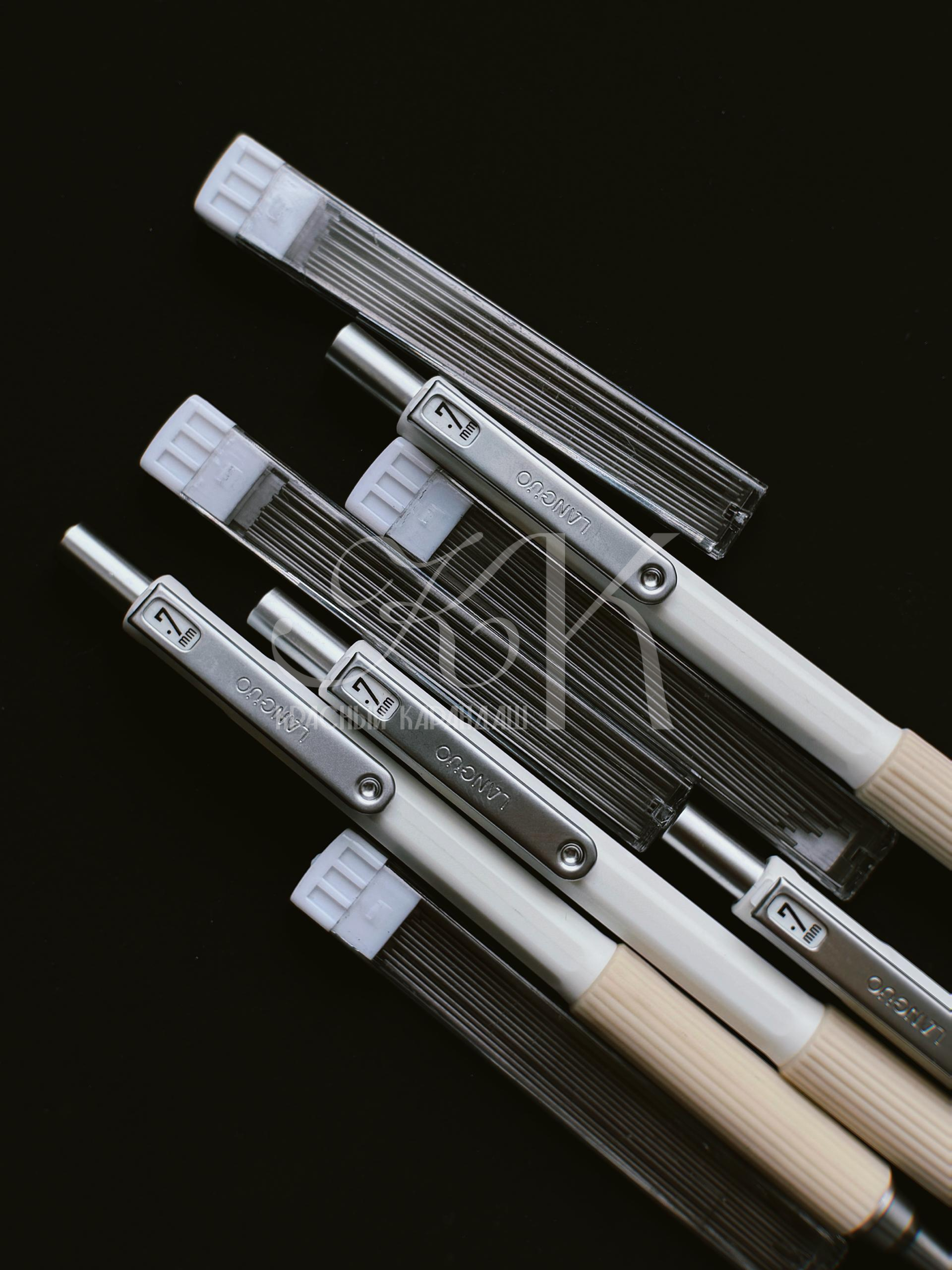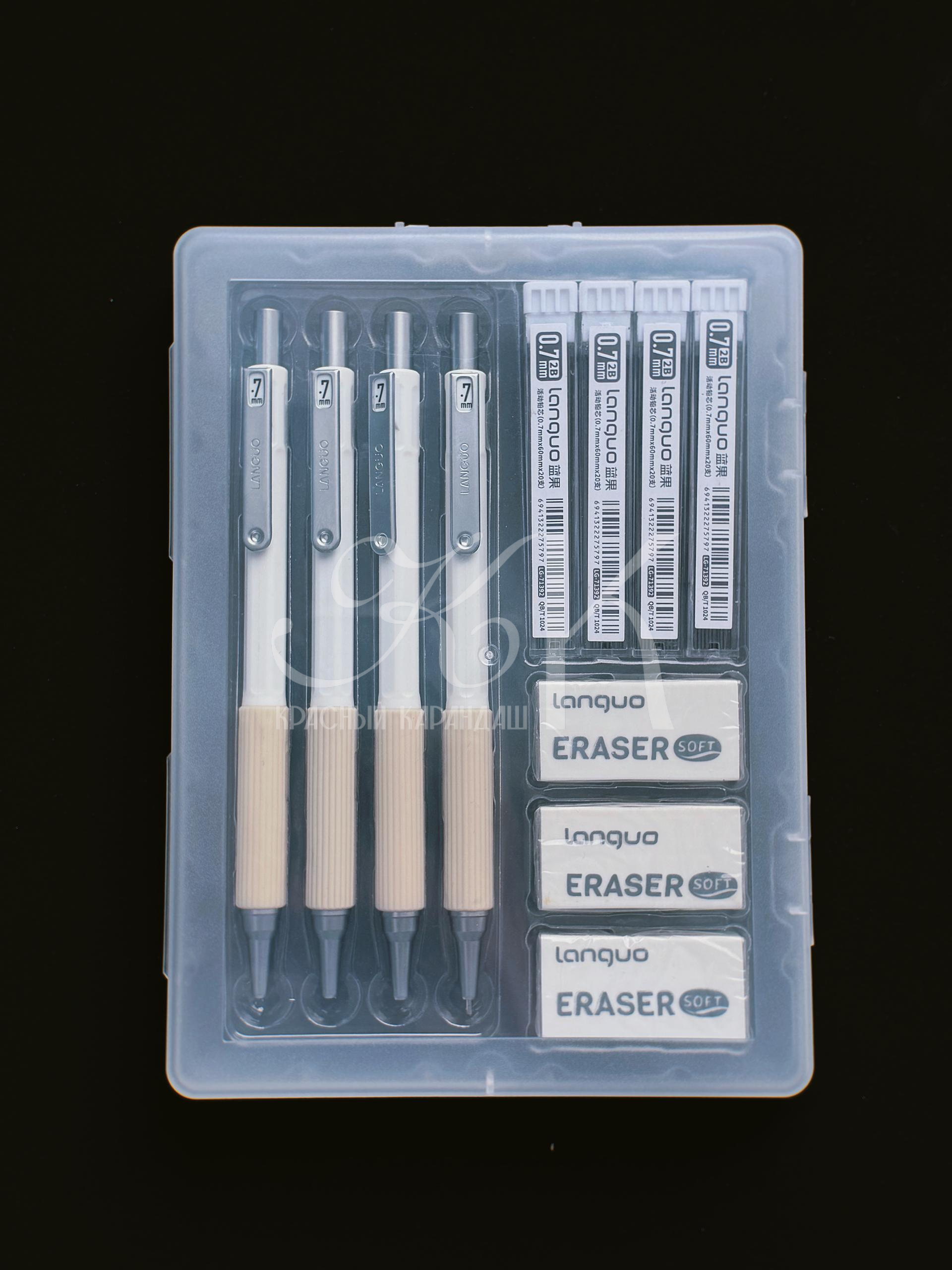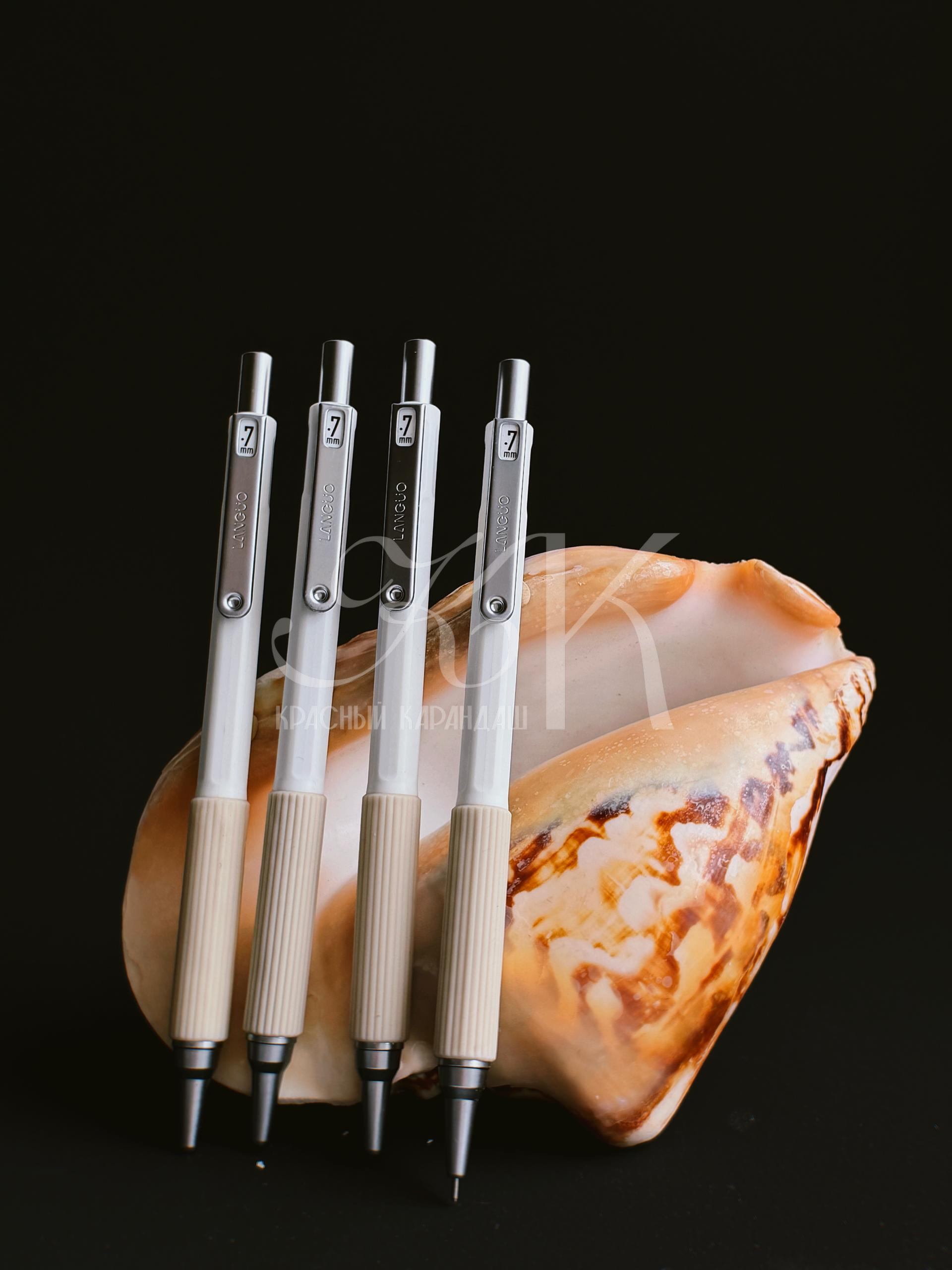 Карандаш механический Languo отличается элегантным дизайном. Пластиковый фигурный корпус с резиновым держателем и металлическим наконечником. Подача грифеля осуществляется с помощью кнопочного механизма, под корпусом кнопки расположен небольшой ластик.