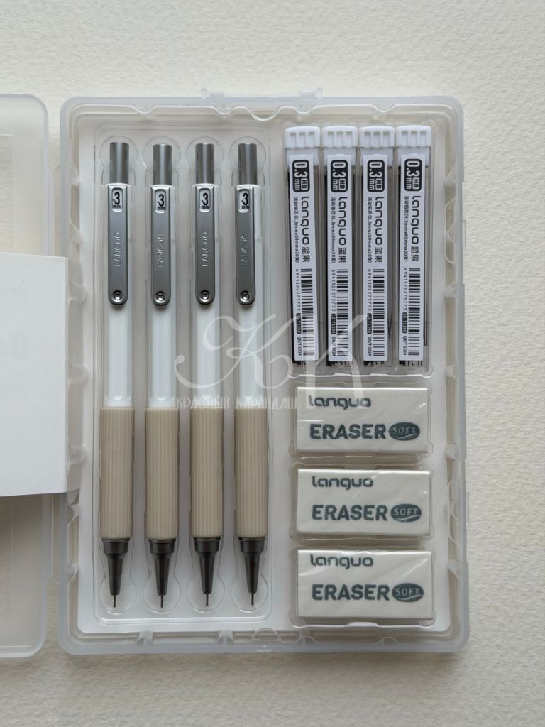Карандаш механический Languo отличается элегантным дизайном. Пластиковый фигурный корпус с резиновым держателем и металлическим наконечником. Подача грифеля осуществляется с помощью кнопочного механизма, под корпусом кнопки расположен небольшой ластик.