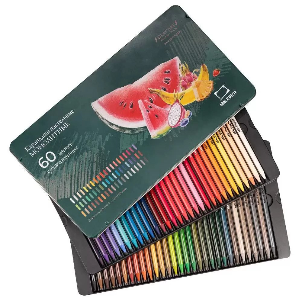 Набор из 60 художественных монолитных пастельных карандашей «Малевичъ» Graf'Art средней жесткости для графики и сухих техник. Карандаши сочетаются с классической сухой пастелью, углем, мелом, а также могут использоваться в смешанной технике с соусом (по-сухому). Основные характеристики: высокие показатели сцепления с бумагой и смешиваемости между несколькими цветами; равномерность и плавность линий, без прерывания и точек; карандаши просто затачивать, они не крошатся и не царапают бумагу; благодаря полимерному покрытию не пачкают руки при работе. Для достижения наилучшего результата используйте фактурную бумагу для графики или специальную бумагу для пастели.