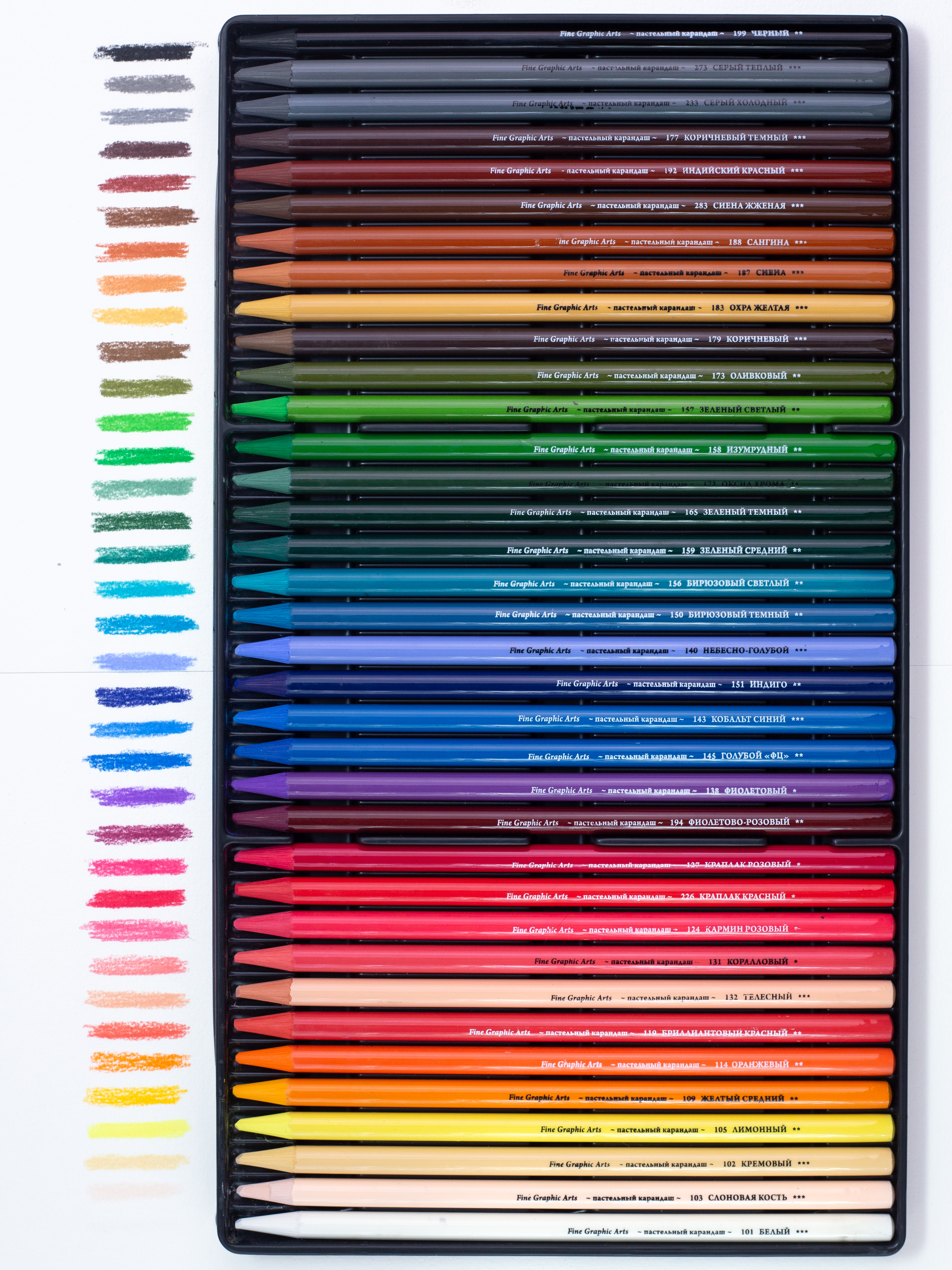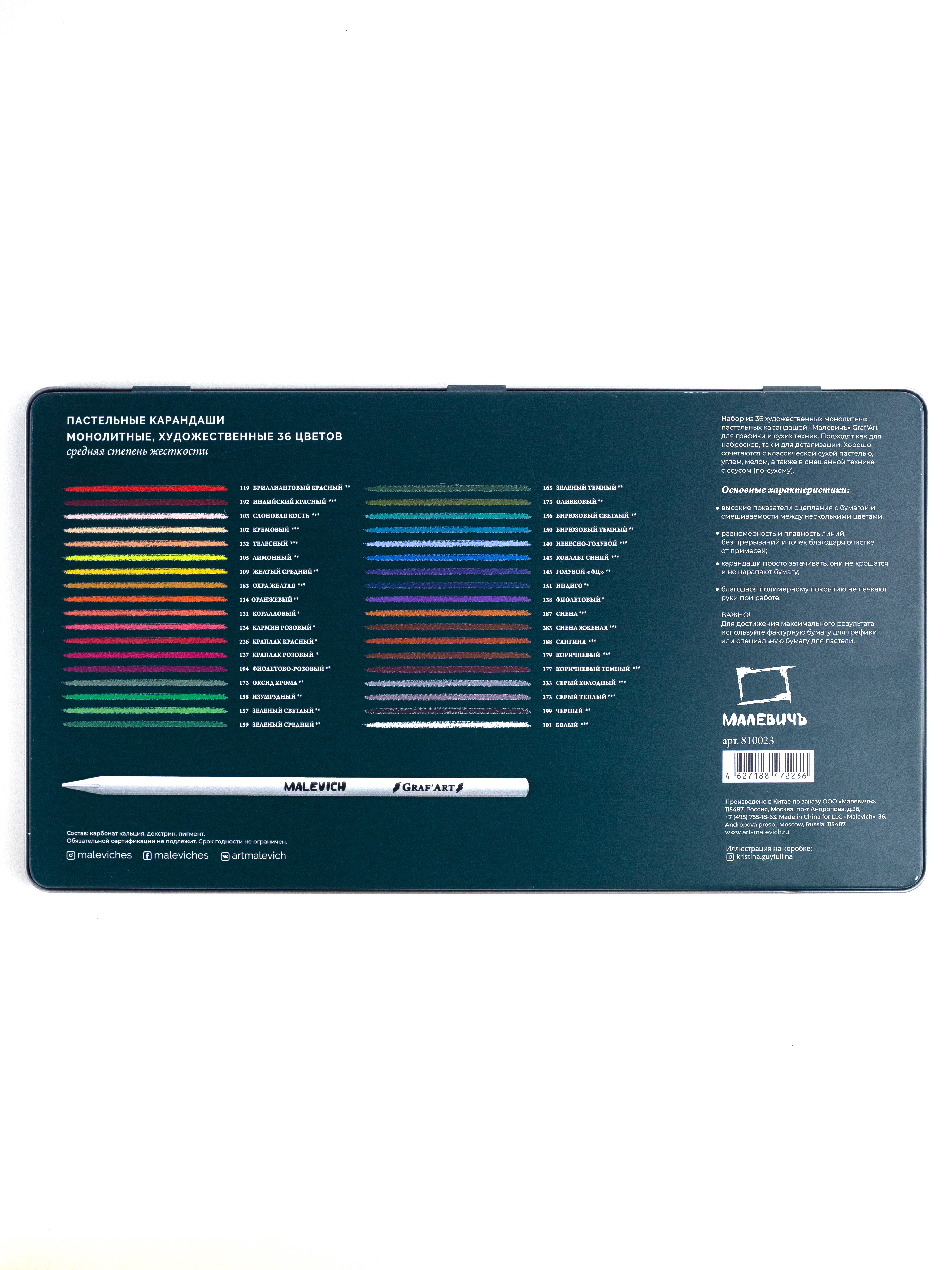 Набор из 36-ти художественных монолитных пастельных карандашей «Малевичъ» Graf'Art средней жесткости для графики и сухих техник. Карандаши сочетаются с классической сухой пастелью, углем, мелом, а также могут использоваться в смешанной технике с соусом (по-сухому). Основные характеристики: высокие показатели сцепления с бумагой и смешиваемости между несколькими цветами; равномерность и плавность линий, без прерывания и точек; карандаши просто затачивать, они не крошатся и не царапают бумагу; благодаря полимерному покрытию не пачкают руки при работе. Для достижения наилучшего результата используйте фактурную бумагу для графики или специальную бумагу для пастели.