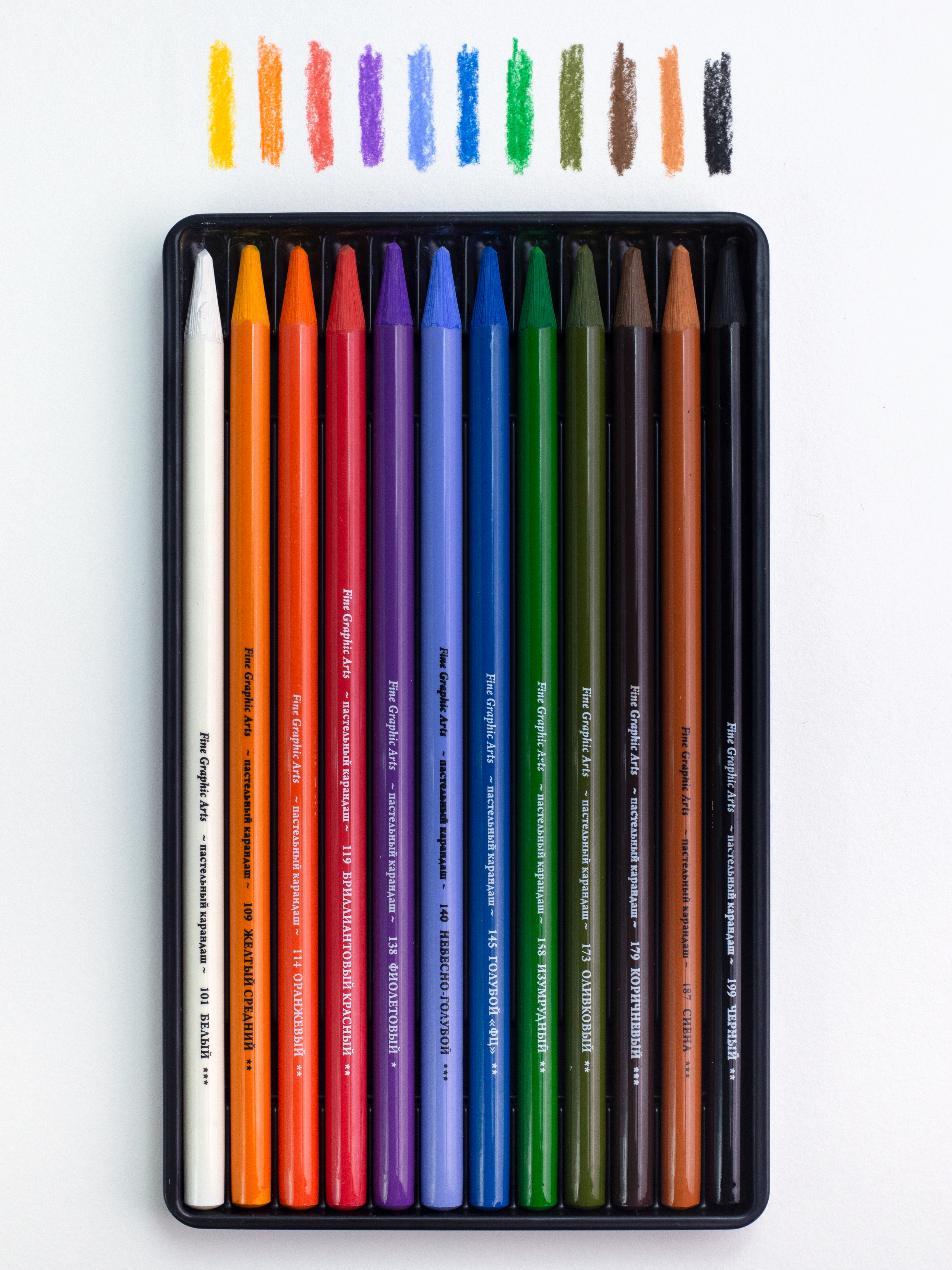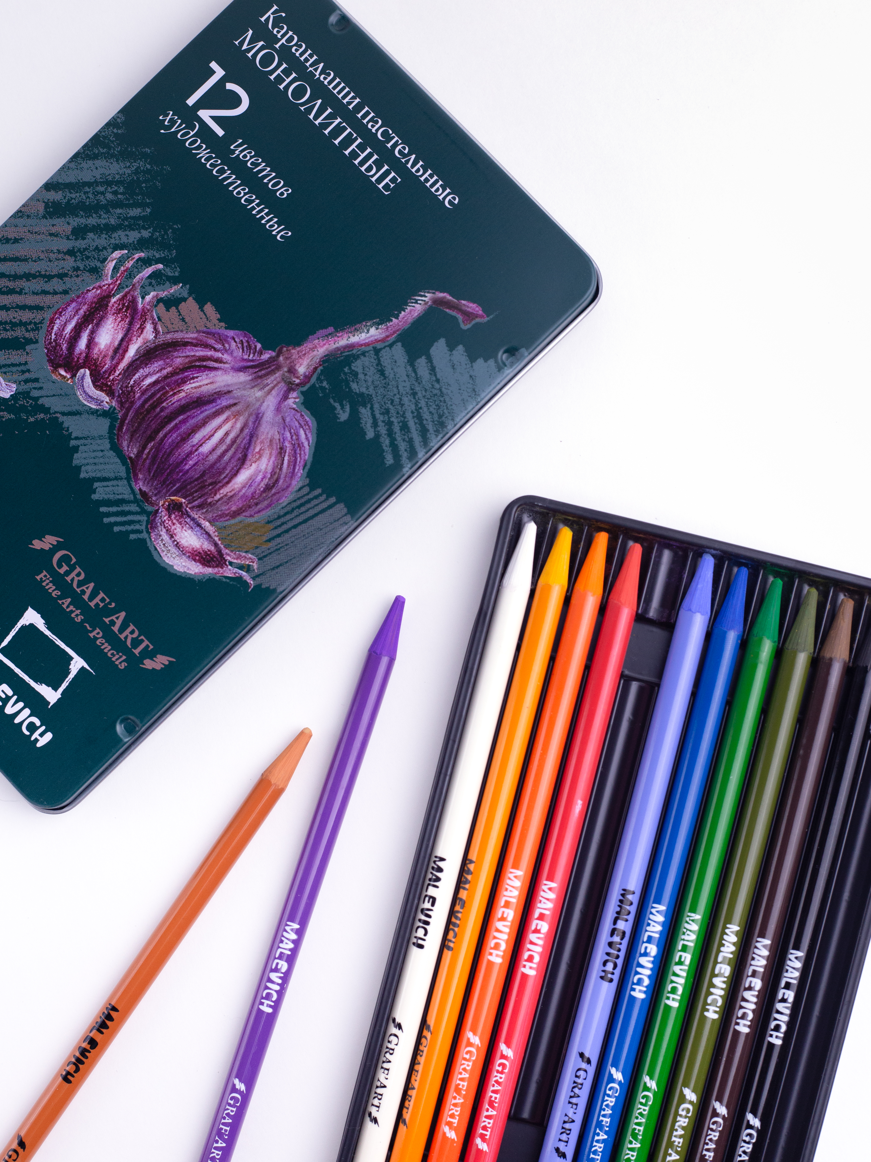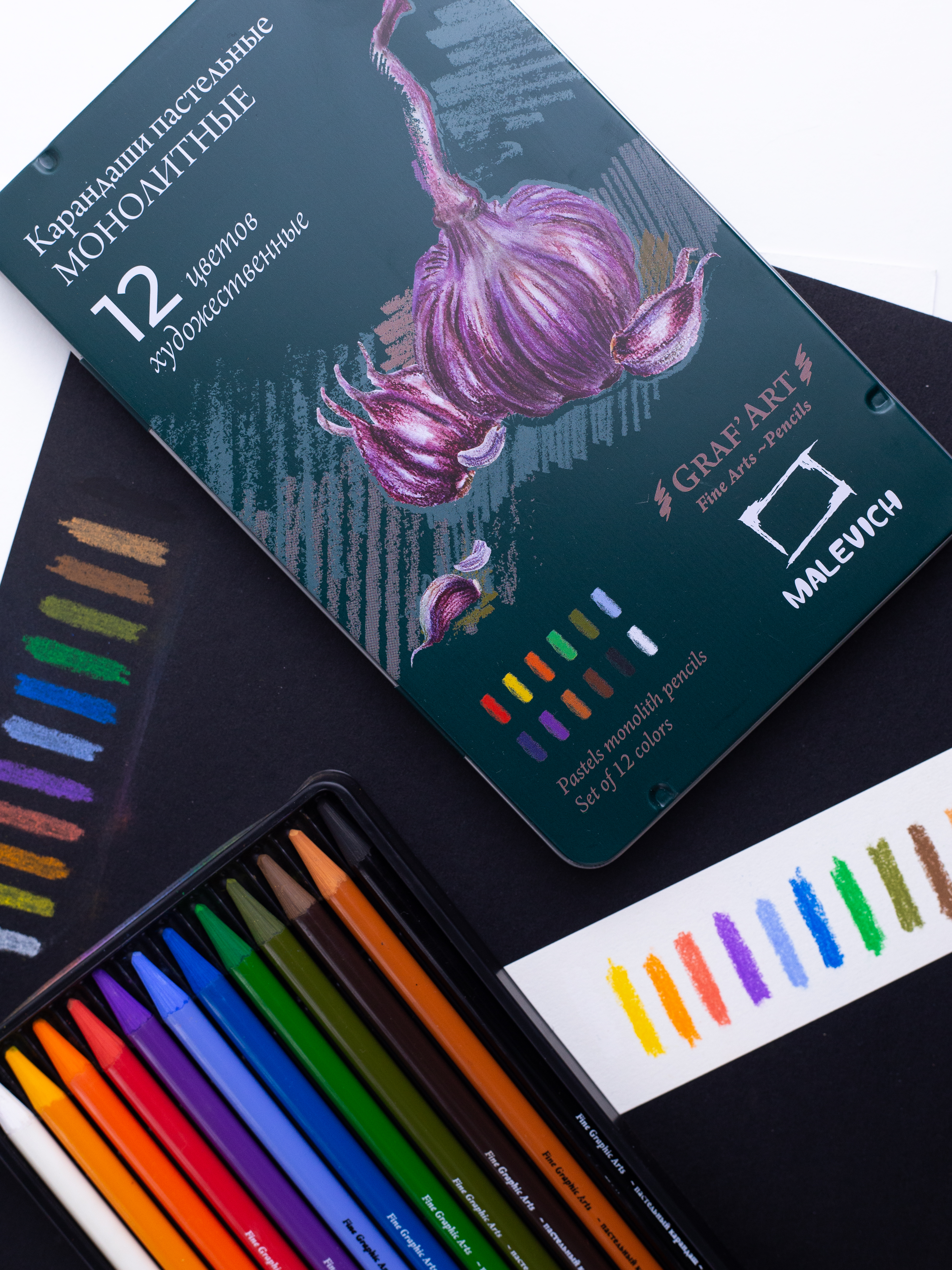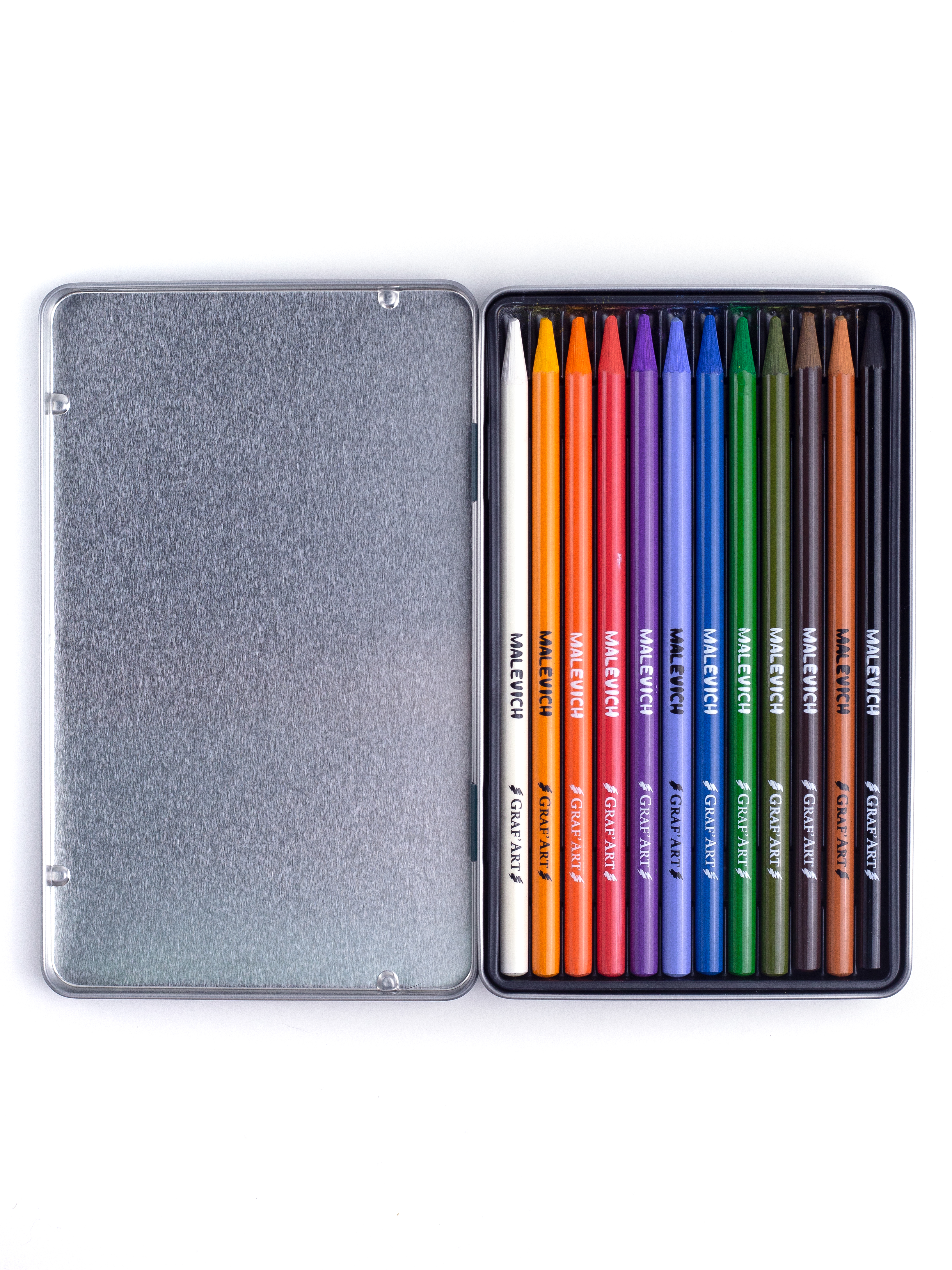 Набор из 12-ти художественных монолитных пастельных карандашей «Малевичъ» Graf'Art средней жесткости для графики и сухих техник. Карандаши сочетаются с классической сухой пастелью, углем, мелом, а также могут использоваться в смешанной технике с соусом (по-сухому). Основные характеристики: высокие показатели сцепления с бумагой и смешиваемости между несколькими цветами; равномерность и плавность линий, без прерывания и точек; карандаши просто затачивать, они не крошатся и не царапают бумагу; благодаря полимерному покрытию не пачкают руки при работе. Для достижения максимального результата используйте фактурную бумагу для графики или специальную бумагу для пастели. Цвета в наборе: 119 бриллиантовый красный; 109 желтый средний; 114 оранжевый; 158 изумрудный; 173 оливковый; 140 небесно-голубой; 145 голубой ФЦ; 138 фиолетовый; 187 сиена; 179 коричневый; 199 черный; 101 белый.
