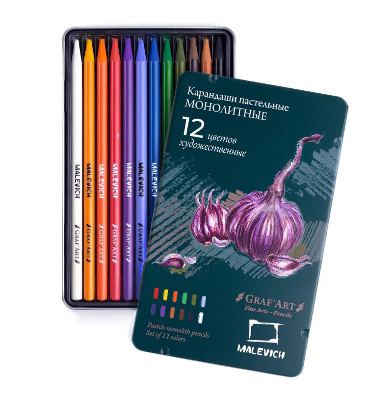 Набор из 12-ти художественных монолитных пастельных карандашей «Малевичъ» Graf'Art средней жесткости для графики и сухих техник. Карандаши сочетаются с классической сухой пастелью, углем, мелом, а также могут использоваться в смешанной технике с соусом (по-сухому). Основные характеристики: высокие показатели сцепления с бумагой и смешиваемости между несколькими цветами; равномерность и плавность линий, без прерывания и точек; карандаши просто затачивать, они не крошатся и не царапают бумагу; благодаря полимерному покрытию не пачкают руки при работе. Для достижения максимального результата используйте фактурную бумагу для графики или специальную бумагу для пастели. Цвета в наборе: 119 бриллиантовый красный; 109 желтый средний; 114 оранжевый; 158 изумрудный; 173 оливковый; 140 небесно-голубой; 145 голубой ФЦ; 138 фиолетовый; 187 сиена; 179 коричневый; 199 черный; 101 белый.