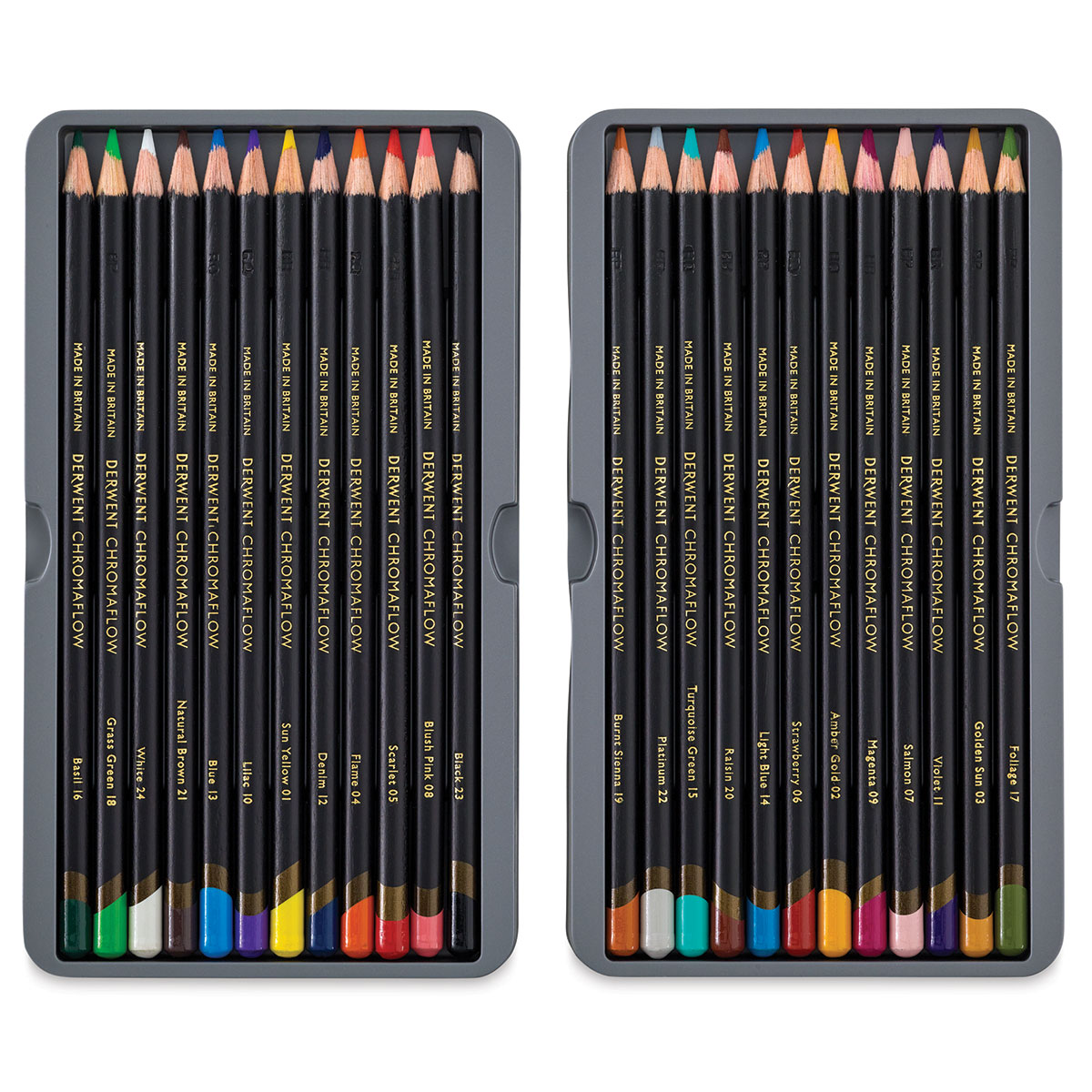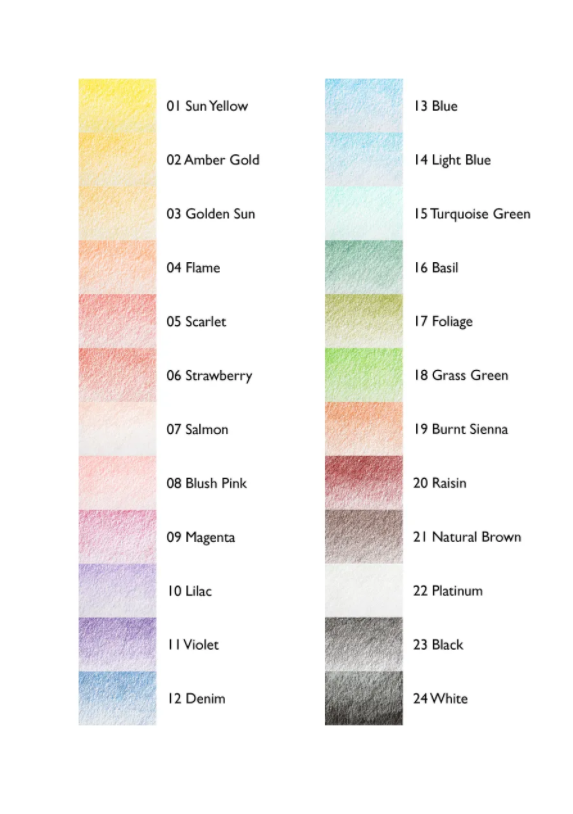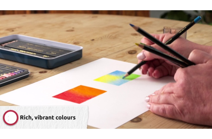 Цветные карандаши серии Chromaflow — это новинка 2021 года от Derwent. Особо прочный грифель и корпус карандашей из высококачественной древесины выдерживают высокое давление при рисовании и заточке, все цвета отлично смешиваются между собой и подходят для различных графических техник и стилей. Высокое содержание пигмента обеспечивает насыщенные цвета с высокой укрывной способностью даже на бумаге черного цвета, палитра серии идеальна для создания ярких акцентов в работе. Грифель карандашей средней мягкости — чуть мягче, чем в серии Procolour, но тверже чем у карандашей линейки Coloursoft. Цвет легко ложится на бумагу различного цвета, обеспечивая мягкий бархатистый штрих без резких видимых границ. Серия представлена наборами 24 и 12 цветов.