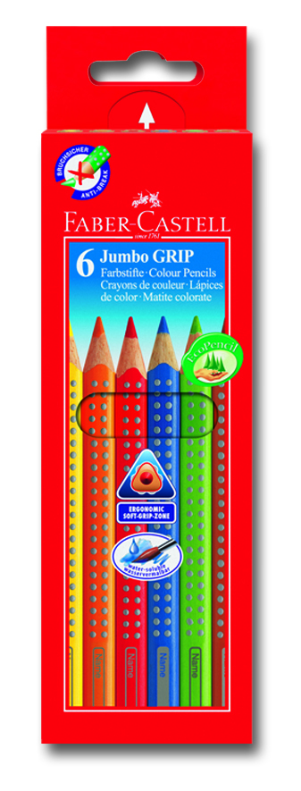 О серии: «Jumbo Grip» - это цветные водоразмываемые карандаши с треугольным корпусом. Карандаши хорошо пишут практически по любой бумаге. Обладают яркими и насыщенными цветами. Отличается от других карандашей утолщённым трёхгранным корпусом, который покрыл лаком на водной основе. На корпусе есть специальное место, на котором можно написать имя владельца. Карандаш удобно держать в руке не только взрослым, но и детям. Представлены в наборах по 6 и 12 цветов, а также поштучно ограниченной палитрой. Характеристика: яркие и насыщенные цвета. Размываются водой. Утолщённый трехгранный, покрытый лаком на водной основе корпус с антискользищими подушечками. Корпус выполнен из мягкой древесины, которая делает заточку удобной. Толщина грифеля 3,8 миллиметра. Применение: для графических и художественных работ. Подходит для детского творчества. Производство: История компании «Faber-Castell» («Фабер-Кастелл») начинается в 1761 году в баварском городе Штайн. Столяр Каспер Фабер создал карандаш, который послужил основанием первой в мире мануфактуры по производству деревянных карандашей. Новая эра в развитии мануфактуры началась в 1839 году, когда во главе предприятия встал 22-летний Лотар фон Фабер. Именно он выпустил первый в мире стандартный карандаш определенной длины, диаметра и жёсткости грифеля, что стало эталоном в канцелярском мире. Сегодня в каталоге компании можно найти более 2000 наименований. «Faber-Castell» занимает лидирующие позиции на международном рынке канцелярской продукции и товаров для творчества. Компания продолжает создавать инновации, сохраняя при этом лучшие традиции в производстве.