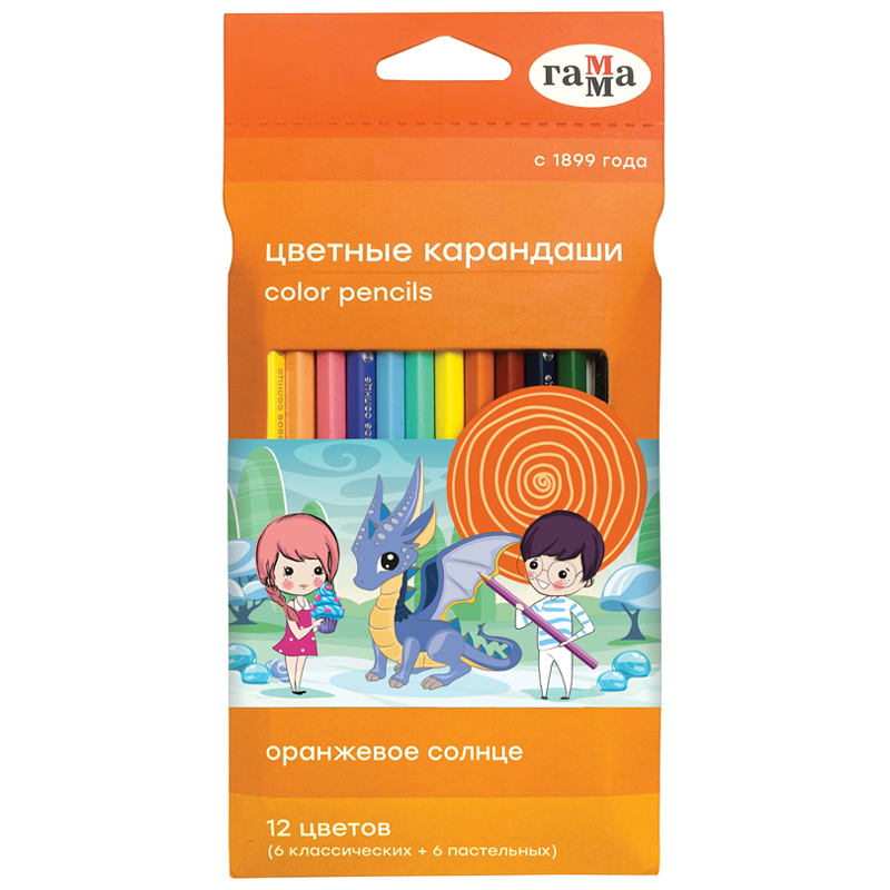Цветные карандаши серии "Оранжевое солнце" в удобной упаковке-конверте имеют расширенную палитру цветов, включающую классические цвета и цвета с различными эффектами. В наборе: 6 классических и 6 пастельных цветов. «Волшебные» цвета дают возможность проявить фантазию и создать любой сказочный сюжет. Шестигранный корпус из мягкой натуральной древесины легко точить. Проклеенный ударопрочный грифель не крошится во время рисования и не ломается даже после падения. За яркость и высокую укрывистость отвечают качественные пигменты в составе. Ребенку не придется сильно давить на карандаш — рисунок получится ярким и равномерно закрашенным.