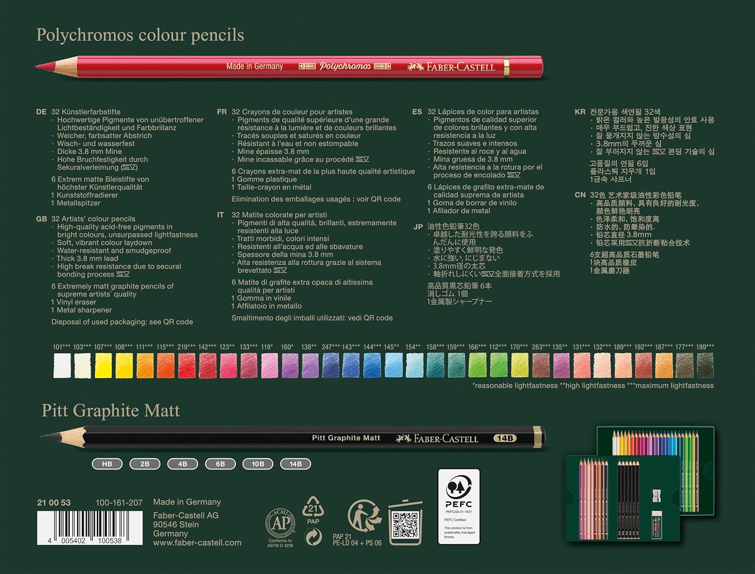 Подарочный набор для графики от Faber Castell станет отличным подарком для всех любителей графики и иллюстраций цветными карандашами. В наборе 32 цветных карандаша серии Polychromos и 6 ультраматовых карандашей Graphite Matt HB, 2B, 4B, 6B, 10B, 14B, а также ластик и точилка. Цветные профессиональные карандаши Polychromos содержат много высококачественного пигмента и воск, за счёт чего обладают высокой светостойкостью, и цвета остаются насыщенными даже при наложении друг на друга. Карандаши Polychromos ценятся среди художников разной квалификации. Уникальная SV-технология, когда грифель вкладывается в пазы, тщательно смазанные синтетической смолой, и очень прочно фиксируется в деревянном корпусе, делает грифель ударостойким. Цвета карандашей - яркие, штрихи - мягкие, они не размазываются и не размываются. Карандаши цветные профессиональные Polychromos имеют круглый корпус, выполненный из специальных хвойных пород.