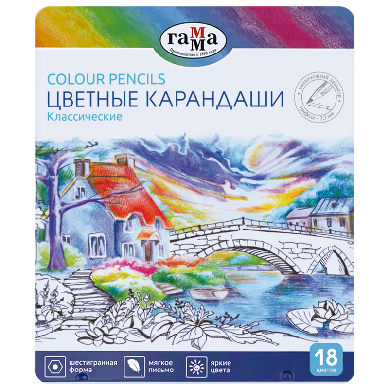 Цветные карандаши Гамма в стильном металлическом пенале отлично подходят в качестве подарка, а также их удобно брать с собой на занятия или на прогулку. Металлическая упаковка надежно сохранит карандаши от повреждений. Увеличенный диаметр грифеля карандашей 3,3 мм способствует легкому скольжению и комфортному рисованию по бумаге любого типа. Натуральная высококачественная древесина специальной обработки гарантирует комфортную заточку без зазубрин и заноз. Проклеенный ударопрочный грифель не крошится во время рисования и не ломается после падения. Карандаши яркие и укрывистые благодаря высококачественным пигментам в составе.