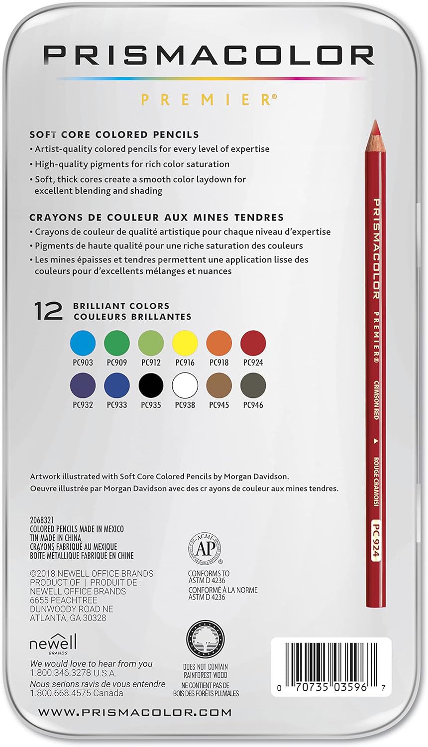 Ультрамягкие цветные карандаши Prismacolor Premier с толстым грифелем идеально подойдут для создания теней, лессировок, растушевок, наложения слоёв и раскрашивания больших поверхностей. Prismacolor Premier — это карандаши профессионального качества с высоким содержанием пигментов, обладают яркими насыщенными цветами, гладко и однородно ложатся на поверхность бумаги любого типа, устойчивы к воздействию света. Мягкий, но плотный грифель карандашей проклеен по всей длине стержня, устойчив к поломкам и сколам. Корпус карандашей круглый, выполнен из качественной древесины, легко затачивается до необходимой остроты. В наборе 12 карандашей разного цвета.