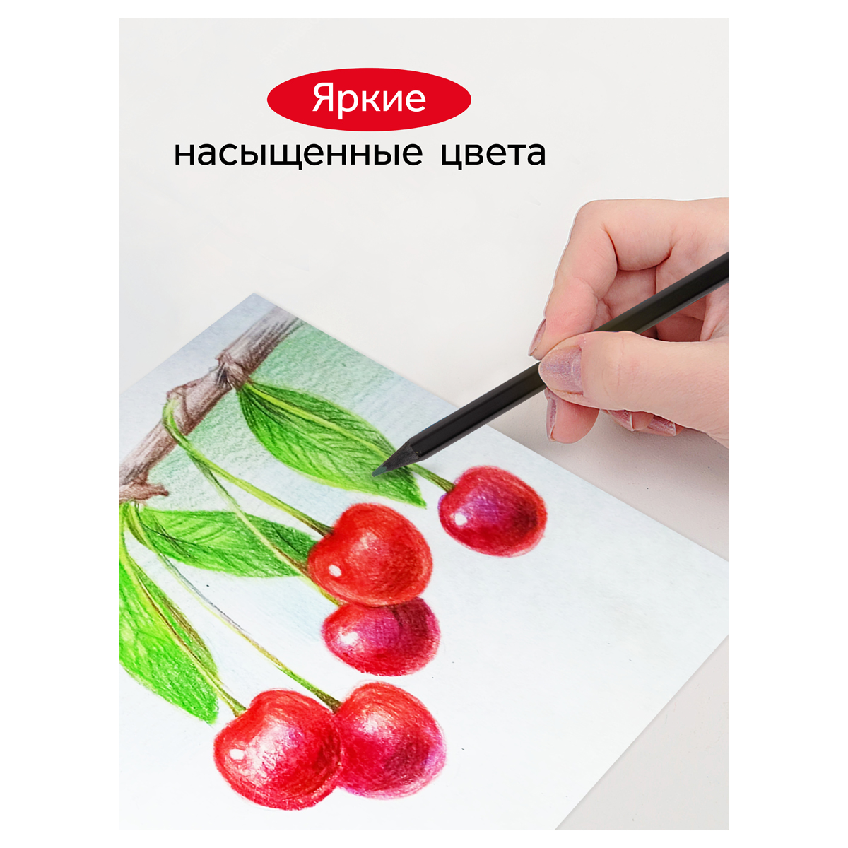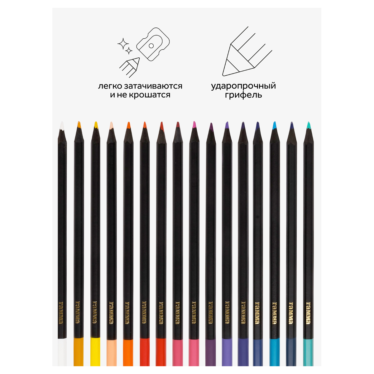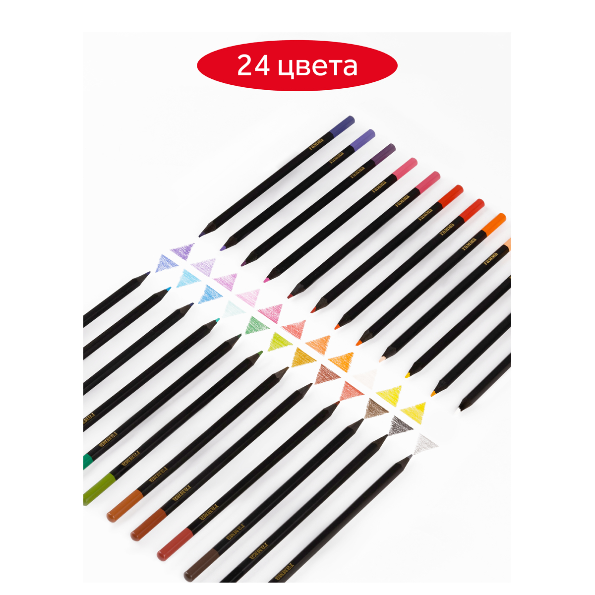 Цветные карандаши «ГАММА» серии «Мультики» выполнены в стильном шестигранном корпусе из высококачественной древесины чёрного цвета. В наборе 24 цвета. Диаметр грифеля — 2,9 мм. Проклеенный ударопрочный грифель не крошится во время заточки и не ломается даже после падения. Корпус карандаша диаметром 7 мм и длиной 174 мм изготовлен из дерева. Специальная обработка древесины позволяет легко заточить карандаш без зазубрин и заноз. За яркость и высокую укрывистость отвечают качественные пигменты в составе. Ребенку не придется сильно давить на карандаш — рисунок получится ярким и равномерно закрашенным.