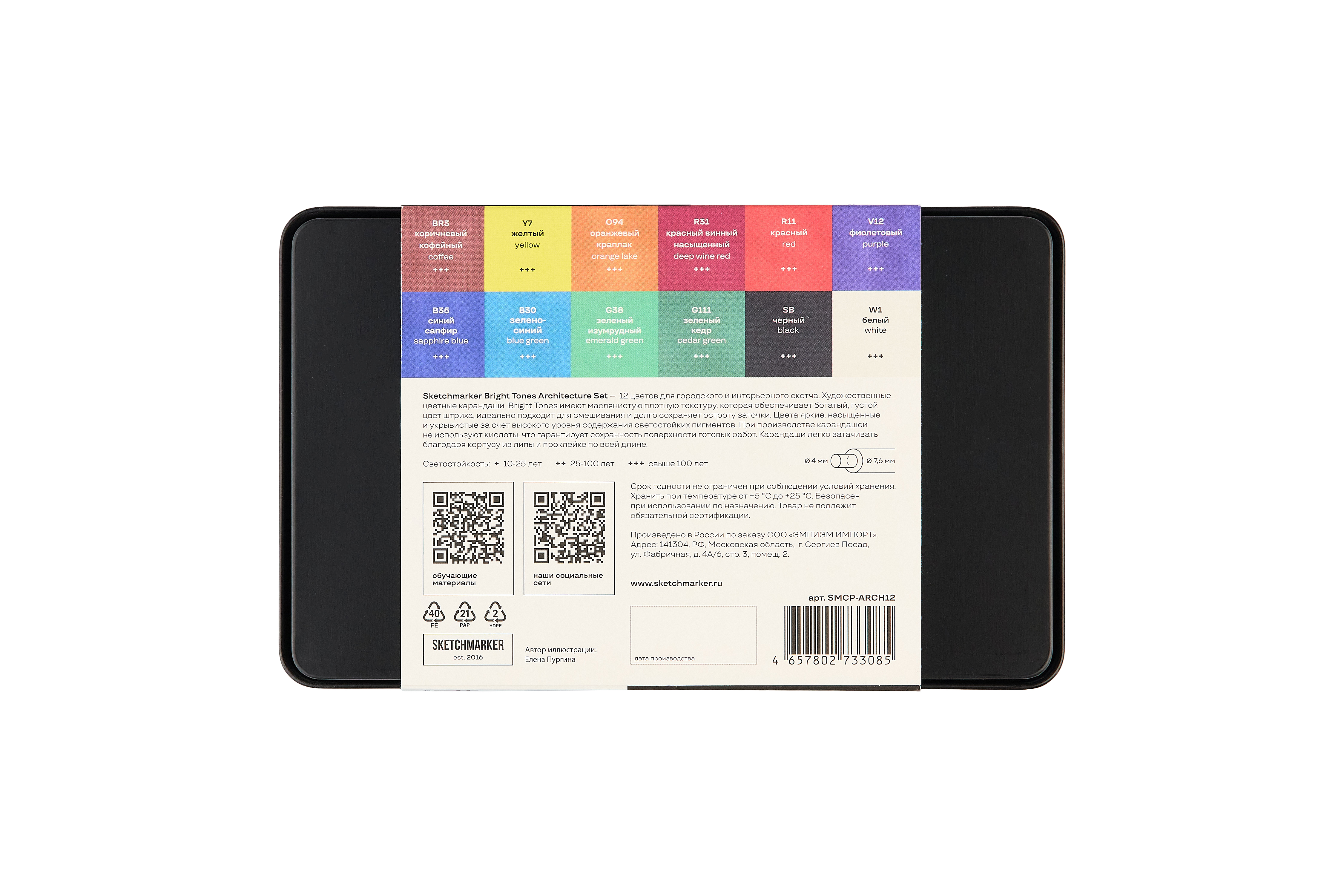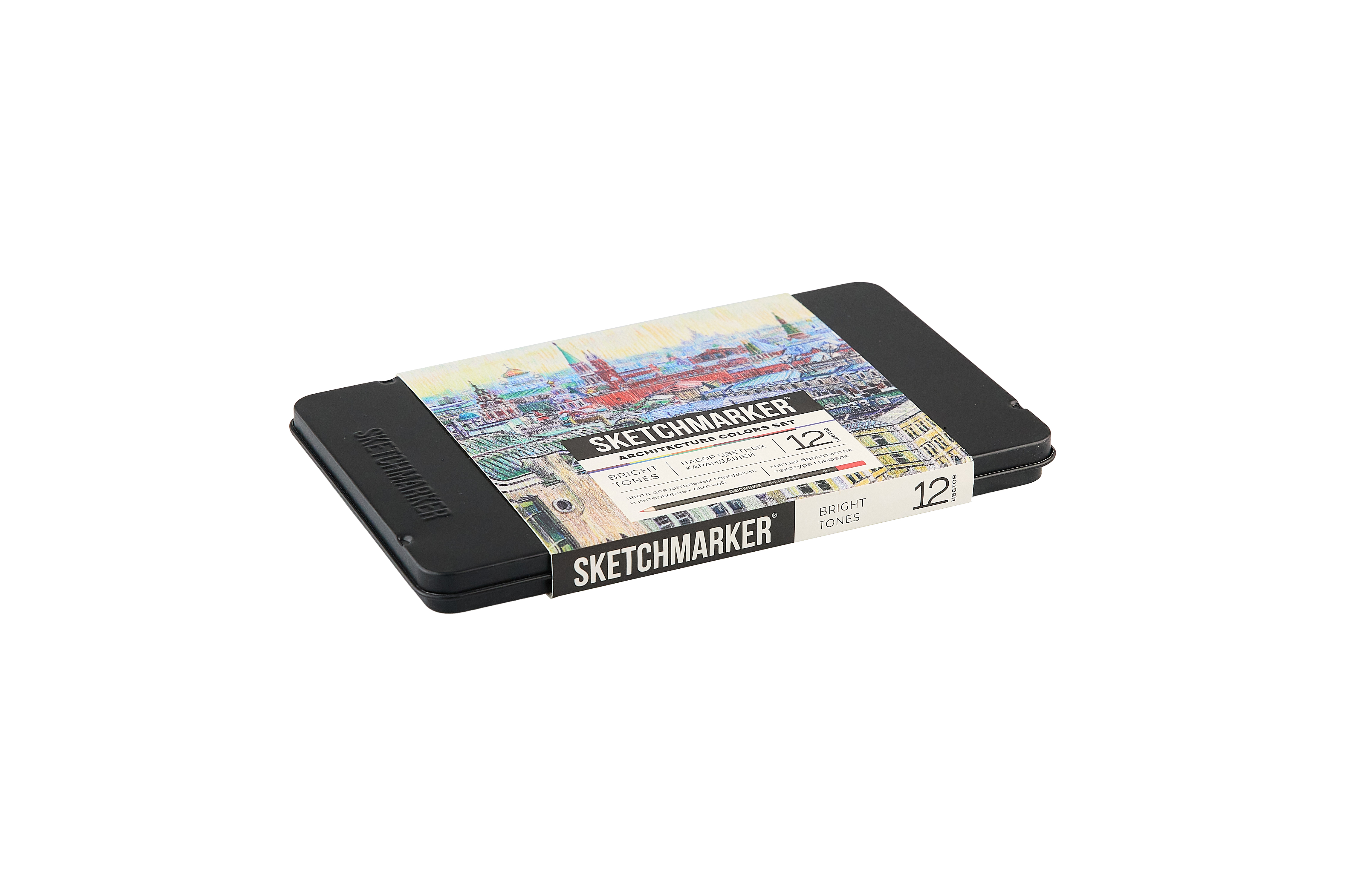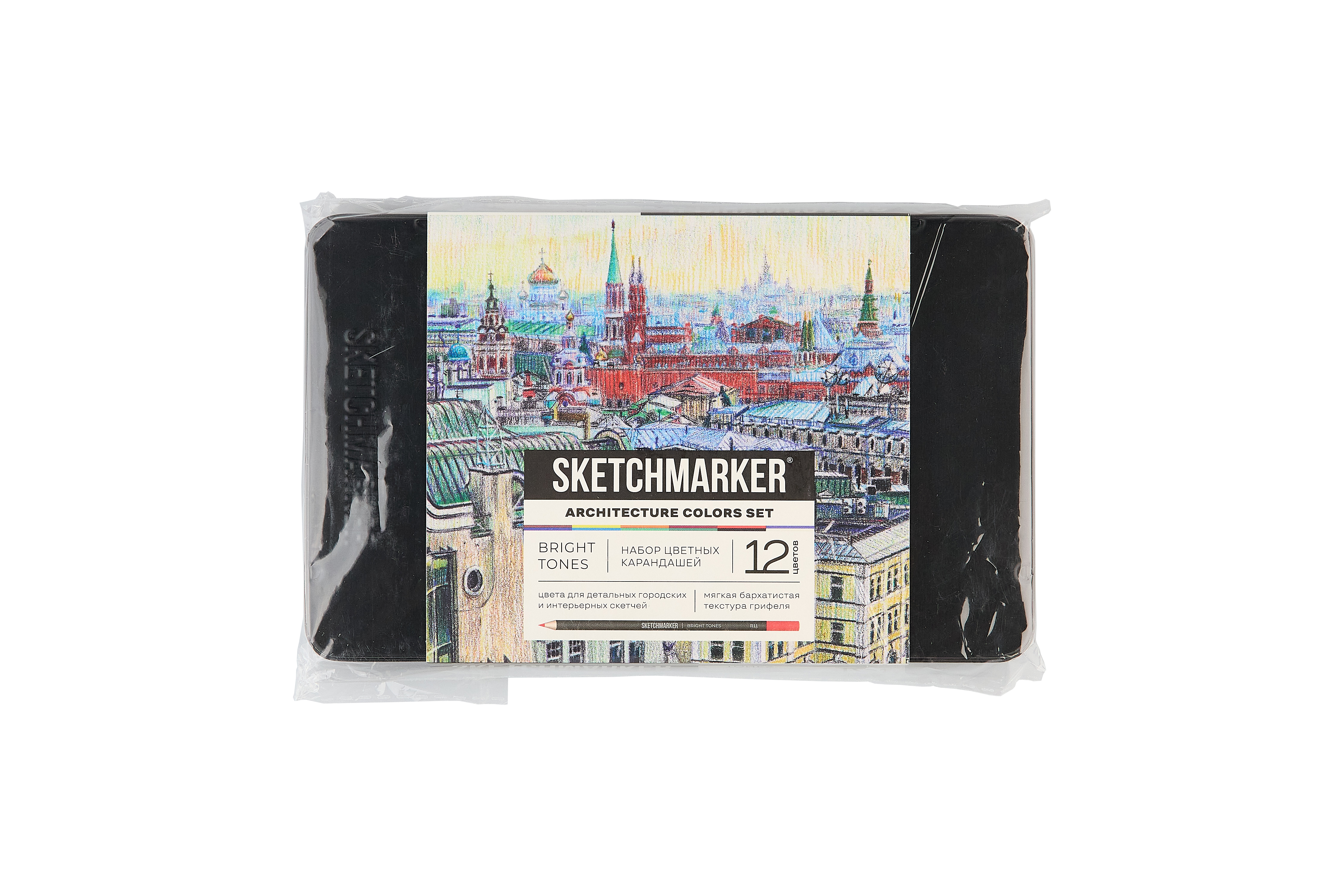 "Sketchmarker Bright Tones Architecture Set – 12 цветов для городского и интерьерного скетча. Цветные карандаши созданы для ежедневного творчества и лёгких ярких зарисовок. Мягкое письмо и удобное нанесение позволяют комфортно раскрашивать и работать с цветом. Оттенки получаются яркими и выразительными, а плотное покрытие помогает легко заполнить цветом большие и малые участки рисунка. Карандаши хорошо наслаиваются друг на друга, позволяя смешивать тона и получать новые оттенки без сложных техник. Карандаши нужно затачивать ножом. Подходят для рисования в скетчбуках; раскрашивания антистресс-раскрасок; создания иллюстраций; создания открыток, плакатов, постеров; использования в коллажах и смешанных техниках; создания зарисовок на пленэре; эскизов и скетчей для дизайнеров, цветовых схем, fashion-скетчинга; концепт-арта; украшения писем и конвертов; оформления подарков; оформления ежедневников, планеров, трекеров. Это надёжный и понятный инструмент для всех, кто любит рисовать просто и с удовольствием. Корпус из липы и проклейка по всей длине. Длина карандаша - 17,5 см; диаметр карандаша - 7,6 мм; толщина грифеля - 4 мм. Длина карандаша - 17,5 см; диаметр карандаша - 7,6 мм; толщина грифеля - 4 мм. Грифель на масляной основе. Цвета в наборе: BR3 коричневый кофейный / coffee +++; R11 красный / red +++; V12 фиолетовый / purple +++; R31 красный винный насыщенный / deep wine red +++; O94 оранжевый краплак / orange lake +++; SB черный / black +++; B30 зелено-синий / blue green +++; B35 синий сапфир / sapphire blue +++; G38 зеленый изумрудный / emerald green +++; G111 зеленый кедр / cedar green +++; W1 белый / white +++"