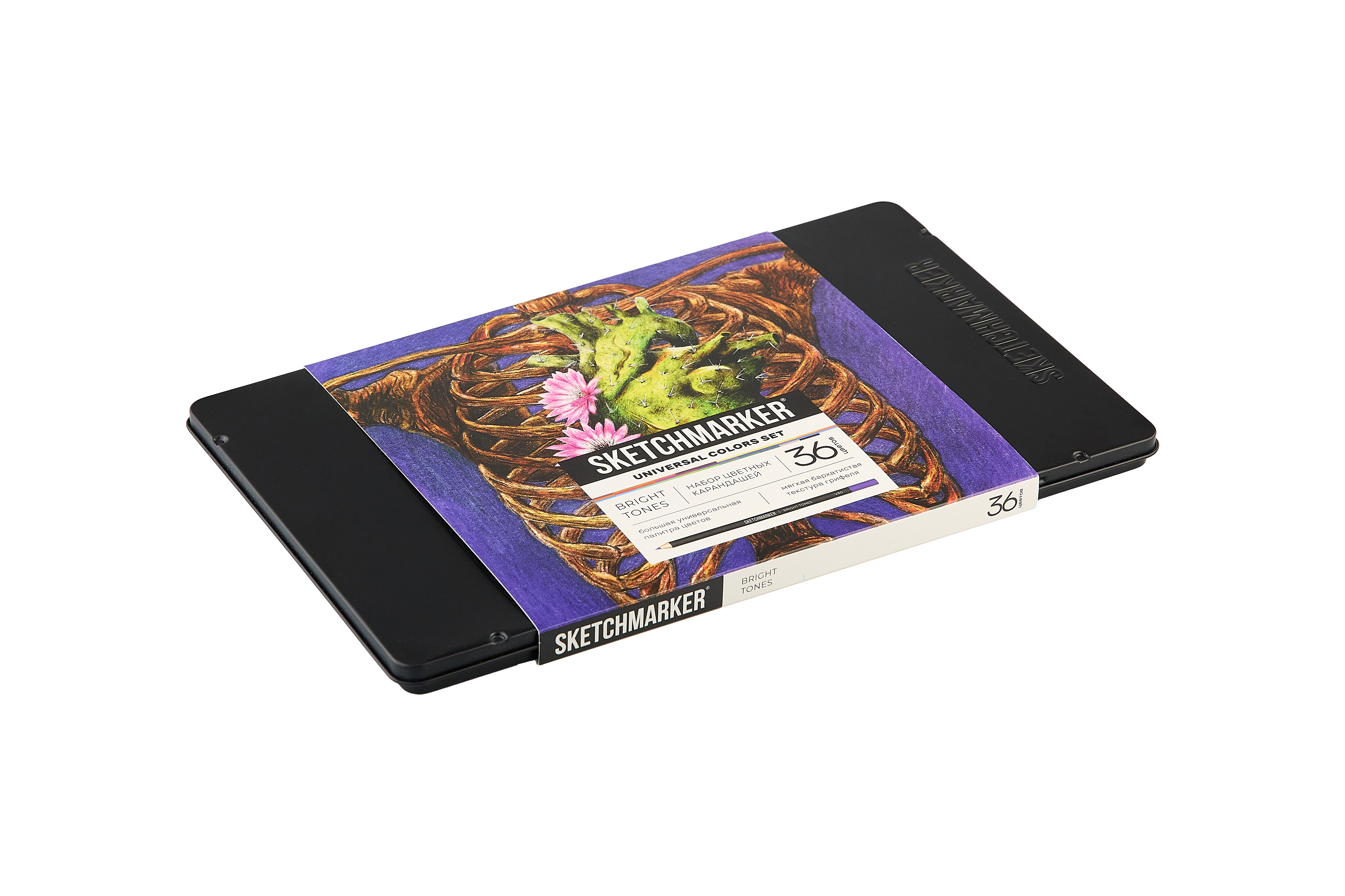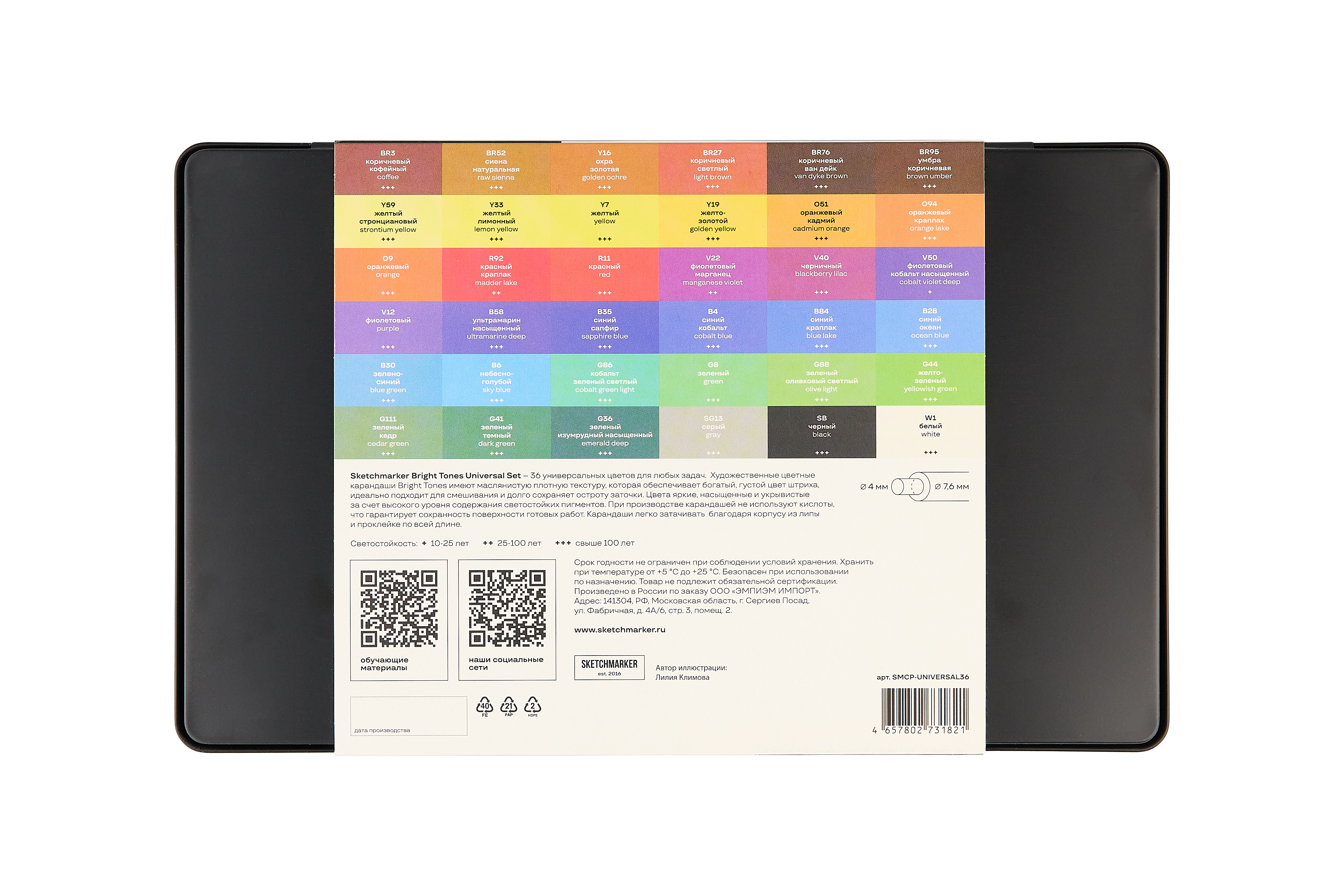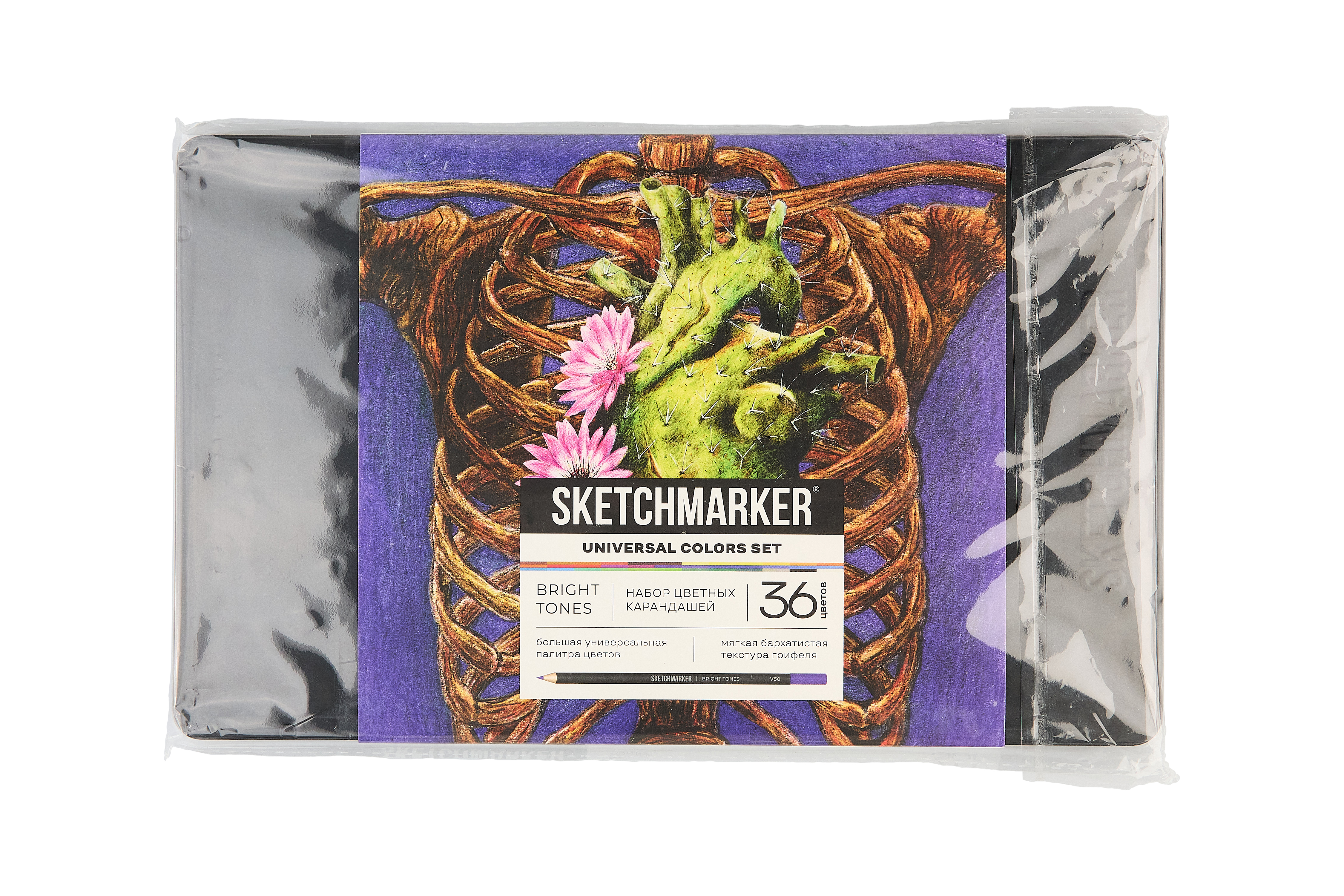 "Sketchmarker Bright Tones Universal Set – 36 универсальных цветов для любых задач. Цветные карандаши созданы для ежедневного творчества и лёгких ярких зарисовок. Мягкое письмо и удобное нанесение позволяют комфортно раскрашивать и работать с цветом. Оттенки получаются яркими и выразительными, а плотное покрытие помогает легко заполнить цветом большие и малые участки рисунка. Карандаши хорошо наслаиваются друг на друга, позволяя смешивать тона и получать новые оттенки без сложных техник. Карандаши нужно затачивать ножом. Подходят для рисования в скетчбуках; раскрашивания антистресс-раскрасок; создания иллюстраций; создания открыток, плакатов, постеров; использования в коллажах и смешанных техниках; создания зарисовок на пленэре; эскизов и скетчей для дизайнеров, цветовых схем, fashion-скетчинга; концепт-арта; украшения писем и конвертов; оформления подарков; оформления ежедневников, планеров, трекеров. Это надёжный и понятный инструмент для всех, кто любит рисовать просто и с удовольствием. Корпус из липы и проклейка по всей длине. Длина карандаша - 17,5 см; диаметр карандаша - 7,6 мм; толщина грифеля - 4 мм. Грифель на масляной основе. Цвета в наборе: BR3 коричневый кофейный / coffee +++; BR52 сиена натуральная / raw sienna +++; BR27 коричневый светлый / light brown +++; BR95 умбра коричневая / brown umber +++; BR76 коричневый ван дейк / van dyke brown +++; Y16 охра золотая / golden ochre +++; Y59 желтый стронциановый / strontium yellow +++; Y33 желтый лимонный / lemon yellow +++; Y7 желтый / yellow +++; Y19 желто-золотой / golden yellow +++; O51 оранжевый кадмий / cadmium orange +++; O94 оранжевый краплак / orange lake +++; O9 оранжевый / orange +++; R92 красный краплак / madder lake ++; R11 красный / red +++; V22 фиолетовый марганец / manganese violet ++; V40 черничный / blackberry lilac +++; V50 фиолетовый кобальт насыщенный / cobalt violet deep +; V12 фиолетовый / purple +++; B58 ультрамарин насыщенный / ultramarine deep +++; B35 синий сапфир / sapphire blue +++; B4 синий кобальт / cobalt blue +++; B84 синий краплак / blue lake +++; B28 синий океан / ocean blue +++; B30 зелёно-синий / blue green +++; B6 небесно-голубой / sky blue +++; G86 кобальт зелёный светлый / cobalt green light +++; G8 зелёный / green +++; G88 зелёный оливковый светлый / olive light +++; G44 жёлто-зелёный / yellowish green +++; G111 зелёный кедр / cedar green +++; G41 зелёный тёмный / dark green +++; G36 зелёный изумрудный насыщенный / emerald deep +++; SG13 серый / gray +++; S6 чёрный / black +++; W1 белый / white +++."