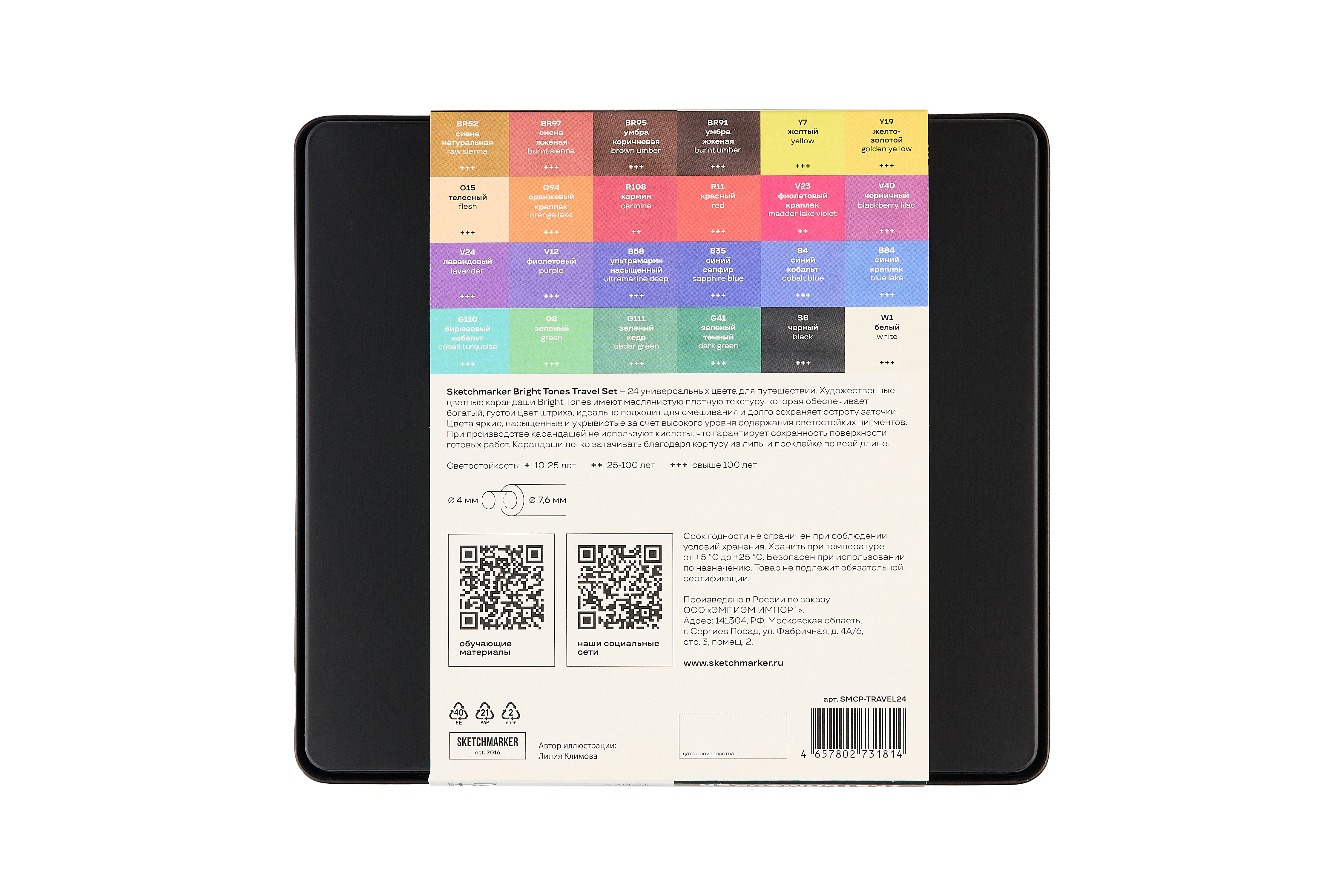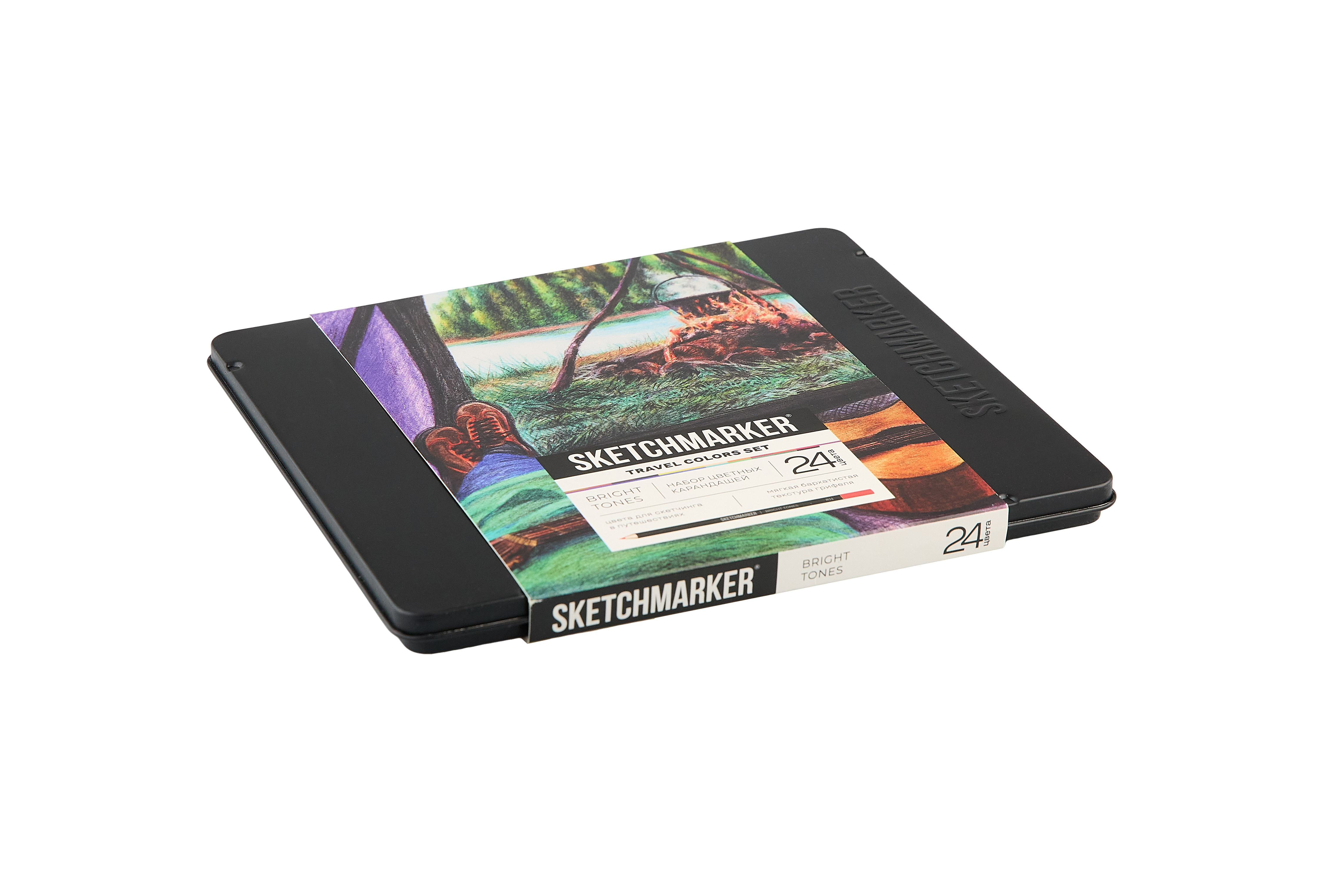 "Sketchmarker Bright Tones Travel Set – 24 универсальных цвета для путешествий. Цветные карандаши созданы для ежедневного творчества и лёгких ярких зарисовок. Мягкое письмо и удобное нанесение позволяют комфортно раскрашивать и работать с цветом. Оттенки получаются яркими и выразительными, а плотное покрытие помогает легко заполнить цветом большие и малые участки рисунка. Карандаши хорошо наслаиваются друг на друга, позволяя смешивать тона и получать новые оттенки без сложных техник. Карандаши нужно затачивать ножом. Подходят для рисования в скетчбуках; раскрашивания антистресс-раскрасок; создания иллюстраций; создания открыток, плакатов, постеров; использования в коллажах и смешанных техниках; создания зарисовок на пленэре; эскизов и скетчей для дизайнеров, цветовых схем, fashion-скетчинга; концепт-арта; украшения писем и конвертов; оформления подарков; оформления ежедневников, планеров, трекеров. Это надёжный и понятный инструмент для всех, кто любит рисовать просто и с удовольствием. Корпус из липы и проклейка по всей длине. Длина карандаша - 17,5 см; диаметр карандаша - 7,6 мм; толщина грифеля - 4 мм. Грифель на масляной основе. Цвета в наборе: BR52 сиена натуральная / raw sienna +++; BR97 сиена жжёная / burnt sienna +++; BR95 умбра коричневая / brown umber +++; BR91 умбра жжёная / burnt umber +++; Y7 жёлтый / yellow +++; Y19 жёлто-золотой / golden yellow +++; O15 телесный / flesh +++; O94 оранжевый краплак / orange lake +++; R108 кармин / carmine ++; R11 красный / red +++; V23 фиолетовый краплак / madder lake violet ++; V40 черничный / blackberry lilac +++; V24 лавандовый / lavender +++; V12 фиолетовый / purple +++; B58 ультрамарин насыщенный / ultramarine deep +++; B35 синий сапфир / sapphire blue +++; B4 синий кобальт / cobalt blue +++; B84 синий краплак / blue lake +++; G110 бирюзовый кобальт / cobalt turquoise +++; G8 зелёный / green +++; G111 зелёный кедр / cedar green +++; G41 зелёный тёмный / dark green +++; S6 чёрный / black +++; W1 белый / white +++."