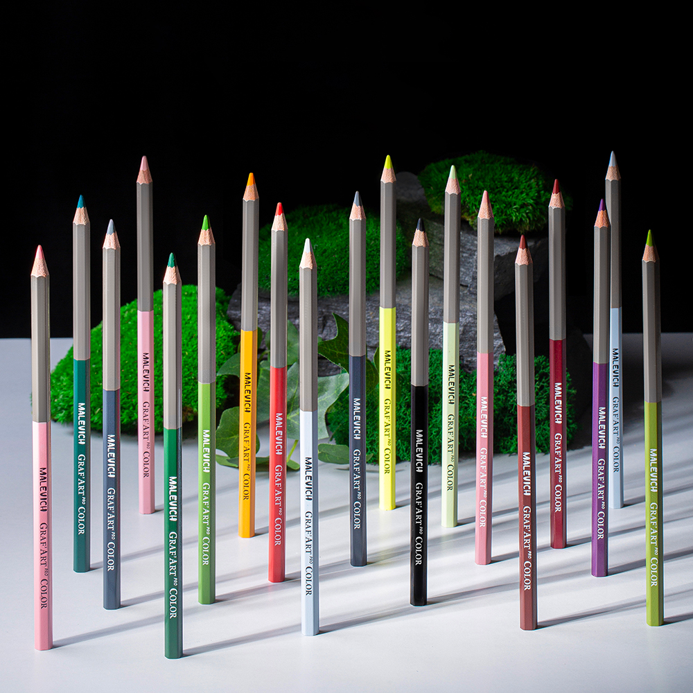 Профессиональные цветные карандаши «Малевичъ» GrafArt PRO на масляной основе средней твердости. Яркие насыщенные пигменты с высокой светостойкостью порадуют любого художника. Карандаши завораживают своей легкостью и свободой в работе не только на белой бумаге, но также на тонированной и даже черной. Высококачественная древесина не создаст проблем при заточке. Толщина грифеля поддается художественной заточке. Простой, но лаконичный дизайн не будет отвлекать во время работы, а цветной корпус послужит ориентиром в поиске нужного оттенка. Шестигранный корпус не позволит карандашам кататься по столу, в отличие от круглых. Интересные оттенки и разнообразная палитра дают возможность создавать реалистичные или фантазийные сюжеты в разных стилях, на разные темы. Карандаши легко смешиваются и наслаиваются друг на друга. В зависимости от порядка наслаивания цвета можно получить разные оттенки. При легком прикосновении к бумаге без усилий остаются воздушные линии через которые будет видна фактура бумаги, это придает рисунку легкость и нежность. Благодаря грифелю средней твердости и масляной основе, меняя силу нажима, можно без труда получать потрясающие градиенты, переходы и заливки.