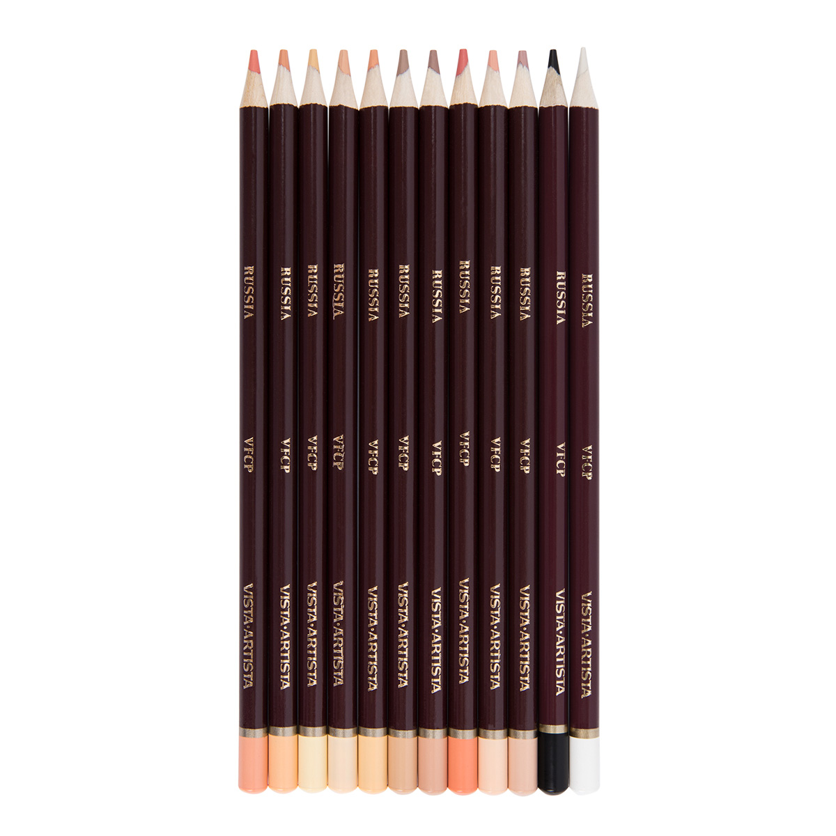 Набор цветных карандашей Vista-Artista Fine Skintones — это 12 цветов от мягких оттенков охры светлой, неаполитанского желтого до темных коричневых тонов, черного цвета. Профессиональные цветные карандаши с высоким содержанием пигмента. Отличаются яркими насыщенными оттенками. Цвета идеально накладываются друг на друга и отлично смешиваются. Подходят для широкого спектра техник. Предназначены для художников, графиков, дизайнеров, архитекторов, и творческих людей. Изготовлены из качественной, химически необработанной древесины липы и мягких грифелей с высоким содержанием пигментов, благодаря чему они легко ложатся на бумагу, прекрасно смешиваются и накладываются друг на друга. Цвета в наборе: ванильный, лососевый, персиковый, абрикосовый, ванильно-розовый, бежевый, медовый, саванна, песочный, карамельный, белила китайские, черный.