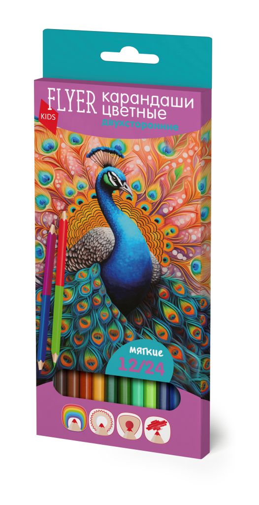 Цветные карандаши от бренда FLYER предназначены для художественного изобразительного творчества детей, школьников и взрослых. Отвечают требованиям безопасности, нетоксичны. Корпус карандашей сделан из натуральной мягкой древесины. Караждый карандаш в наборе двусторонний, а значит вместе с 12 карандашами вы получаете 24 разных цвета. Цвета карандашей насыщенные, грифель карандашей мягкий, не пылит и не крошится. Легко и ровно наносятся на бумагу различного типа. Сплошная проклейка грифеля по технологии SV, обеспечивает достаточно высокую удоропрочность. Легко наносится на бумагу, оставляя яркий штрих, позволяют работать в различных техниках, например, нанесение слоев, штриховка, фротаж, растушевка. Все цвета отлично смешиваются, позволяя создавать плавные переходы. Благодаря эргономичной трехгранной форме корпуса с карандашами легко работать, они удобно располагаются в детской руке и не скатываются с рабочей поверхности.