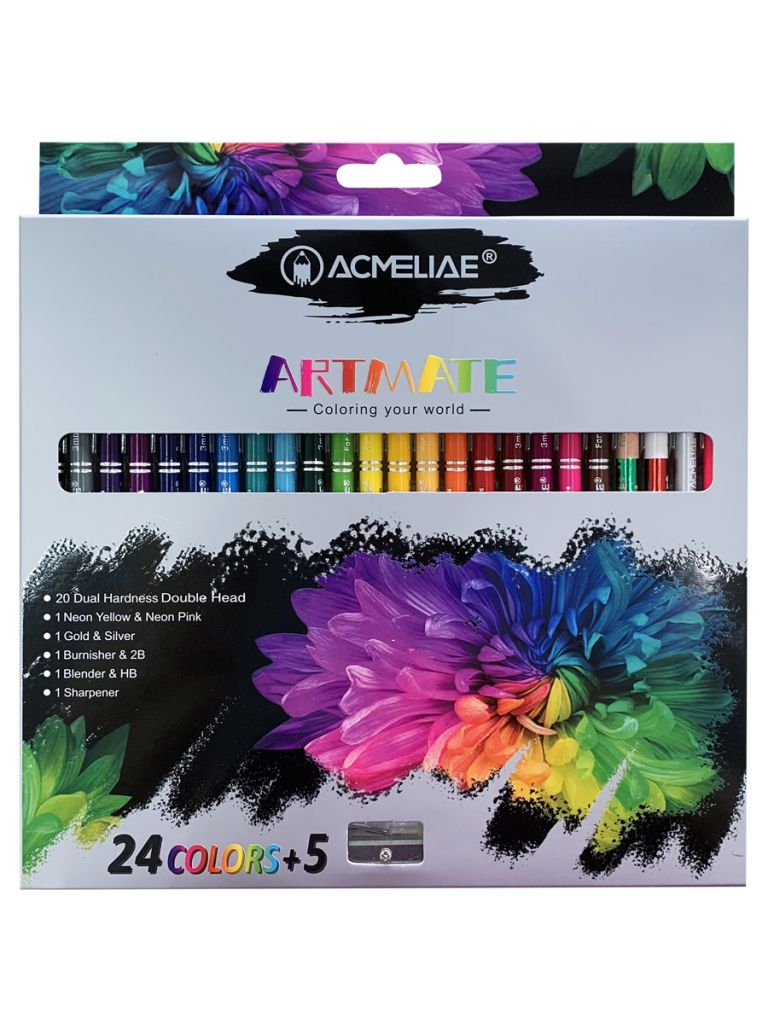 Набор профессиональных карандашей для изобразительного искусства в графических техниках. Состав набора: 20 цветных двусторонних карандашей; 1 неоновый карандаш желтый/розовый; 1 карандаш золотой/серебряный; 1 полирующий карандаш и ч/гр карандаш 2B; 1 карандаш-блендер и ч/гр карандаш HB; 1 точилка. Карандаш-блендер ACMELIAE равномерно смешивает цвета, делает естественными цветовые переходы, убирает зернистость, смягчает и придает однородность текстуре. Позволяет получать новые оттенки и цвета. Это достигается путём нанесения карандаша-блендера поверх основного цвета. В результате, выполненный рисунок, смотрится более гармонично. Полирующий карандаш ACMELIAE – бесцветный карандаш из воска, расширяющий художественные возможности цветных карандашей. Это профессиональный инструмент, используемый для полировки и придания спецэффектов. При нанесении карандаша для полировки поверх основного рисунка, сделанного цветными карандашами, он «соединяет» краситель с бумагой, умешает зернистость, и рисунок становится более ярким, блестящим и глянцевым, а цвет ровным. Он защищает от смешивания цветов и используется для интересных спецэффектов, особенно часто в анималисте при прорисовке шерсти. Подходит для «обратной» техники: если сначала провести линии карандашом-полировщиком ACMELIAE, а поверх него цветным – то из-под цвета будут проступать нанесённые линии.