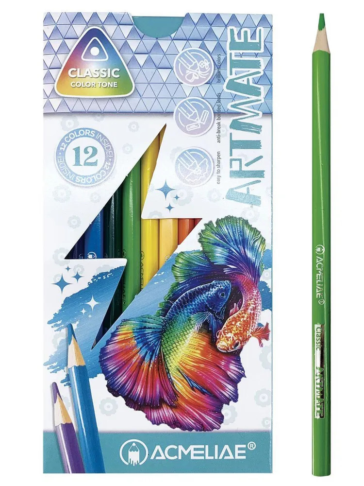 Качественные мягкие цветные карандаши для рисования и художественного творчества серии ARTMATE. В наборе 12 ярких насыщенных цветов с хорошей покрывающей способностью. Мягкий грифель диаметром 3мм обладает повышенной прочностью, легко наносится, не царапает бумагу, не крошится. Рисунки, сделанные ими, получаются очень красивыми и естественными. Специальная проклейка грифеля для максимальной стойкости к поломкам - L.B.S. (связующая система грифеля). Цвета не размываются водой, не выцветают, рисунки надолго сохраняют цвет. Все деревянные карандаши эргономичной трехгранной формы, наиболее удобной для правшей и левшей. Корпус из натурального дерева ровно и аккуратно затачивается. Многослойное лаковое покрытие – идеальный внешний вид карандашей. Длина карандаша 178мм. Подходят для бумаги разного типа, в том числе фактурной.