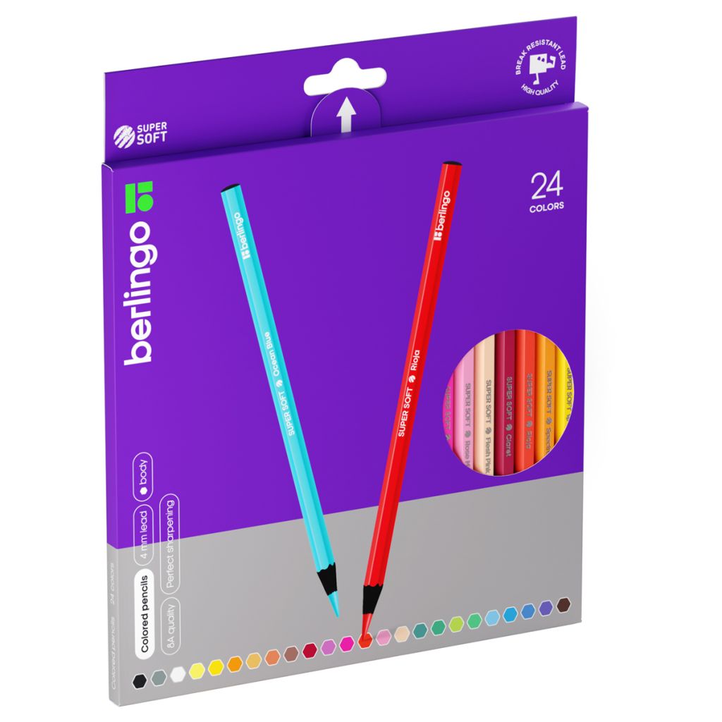 SuperSoft — линейка качественно новых цветных карандашей Berlingo. Черное дерево. Шестигранная форма. Указание цвета на каждом карандаше на английском языке. Поле для подписи имени владельца на каждом карандаше. Упаковка в плотную матовую картонную коробку со склеенным европодвесом. Грифели высочайшего стандарта качества 8А, являющегося максимальным для нехудожественных цветных карандашей. Мягкость письма, сравнимая с рисованием маслом и пастелью. Яркие насыщенные цвета, обладающие превосходной смешиваемостью. Увеличенная до 4 мм толщина грифеля для безупречно комфортного раскрашивания. Уникальная формула и технология производства грифелей, в результате которой достигается одновременно удивительная мягкость письма и прочность, позволяющая грифелю выдерживать даже сильное нажатие под углом 45 градусов. Специальная проклейка, предотвращающая поломку грифеля внутри карандаша при падении. Стойкость к повреждениям. Корпус из древесины высшего качества, прошедшей тщательную обработку. Материал, сохраняющий свою прочность и легко поддающийся ровной заточке без усилий. Уникальная антибактериальная обработка на специализированном оборудовании, гарантирующая безопасное использование продукции детьми.