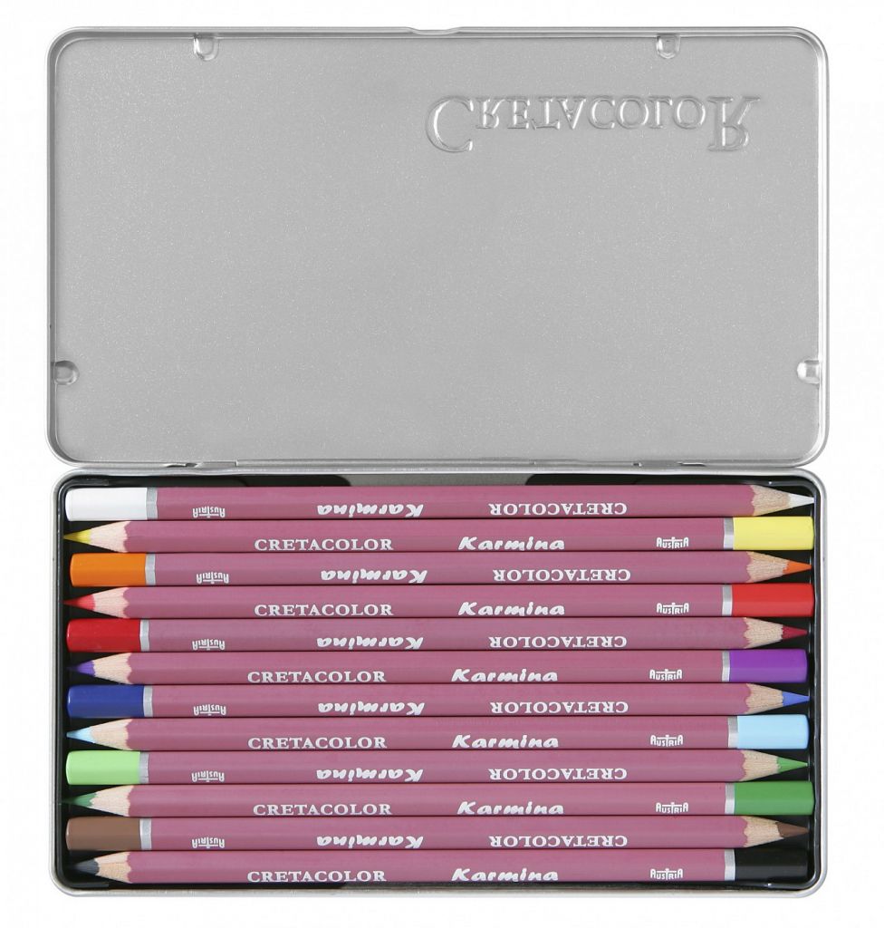 Набор профессиональных цветных карандашей CretacoloR с водостойким мягким стержнем. Цветные карандаши «Karmina» имеют высокую светостойкость, а высокое содержание натуральных высококачественных пигментов дают хорошо выраженные яркие цветовые тона. Данные карандаши идеально подходят для работы в различных техниках, например – нанесение слоя за слоем, штриховка, фроттаж, растушёвка, а так же идеально подходят для применения с другими художественными материалами. Идеально гладкий стержень диаметром 3,8 мм наносит мягкий насыщенный штрих.