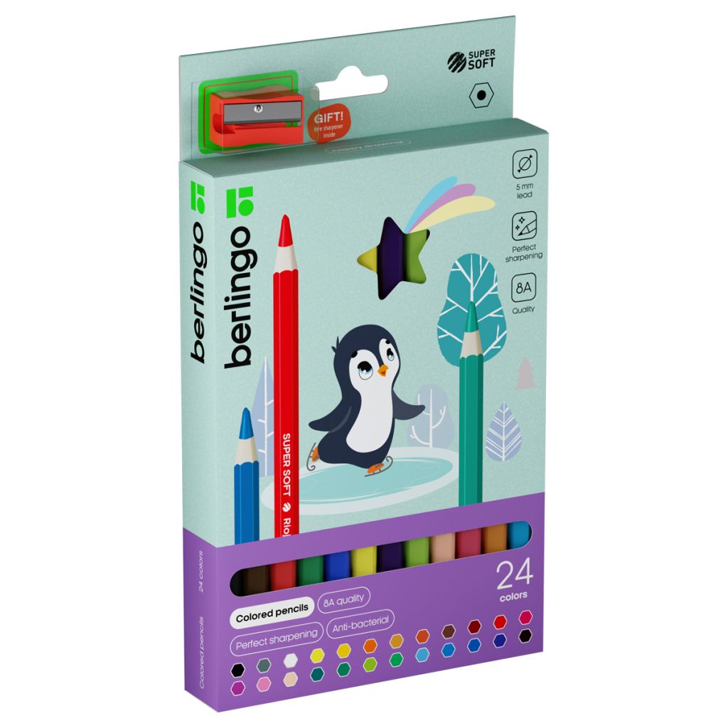 SuperSoft — линейка качественно новых цветных карандашей Berlingo. Набор из 24 цветов. Шестигранная утолщенная форма корпуса удобно ложится в руку ребенка. Указание цвета на каждом карандаше на английском языке. Поле для подписи имени владельца на каждом карандаше. Упаковка в плотную матовую картонную коробку со склеенным европодвесом. Грифели высочайшего стандарта качества 8А, являющегося максимальным для нехудожественных цветных карандашей. Мягкость письма, сравнимая с рисованием маслом и пастелью. Яркие насыщенные цвета, обладающие превосходной смешиваемостью. Увеличенная до 5 мм толщина грифеля для безупречно комфортного раскрашивания. Уникальная формула и технология производства грифелей, в результате которой достигается одновременно удивительная мягкость письма и прочность, позволяющая грифелю выдерживать даже сильное нажатие под углом 45 градусов. Специальная проклейка, предотвращающая поломку грифеля внутри карандаша при падении. Стойкость к повреждениям. Корпус из древесины высшего качества, прошедшей тщательную обработку. Материал, сохраняющий свою прочность и легко поддающийся ровной заточке без усилий. Уникальная антибактериальная обработка на специализированном оборудовании, гарантирующая безопасное использование продукции детьми.
