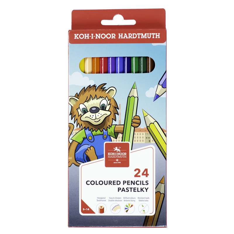 Цветные карандаши "Lion" KOH-I-NOOR предназначены для рисования на бумаге и картоне. Шестигранный корпус, изготовленный из дерева, удобно лежит в руке. Цвета - яркие и насыщенные. Толщина корпуса 7 мм, толщина грифеля 2,8 мм.