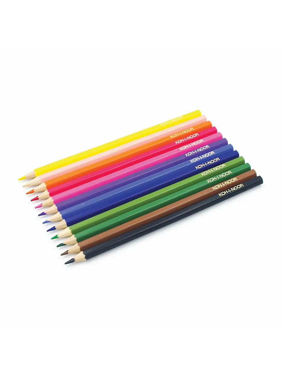Набор карандашей 12 цветов шестигранной формы 2,8 мм. Применение: для художественных и графических работ. Подходит для художников всех уровней. Производство: изготавливаются компанией KOH-I-NOOR HARDTMUTH, которая является самым известным чешским производителем принадлежностей для рисования, канцелярских товаров и товаров для творчества. Компания получила название в честь алмаза «Кохинор» и была основана в 1790 году.