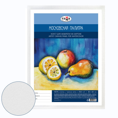 Акварельный холст на картоне предназначен специально для живописи акварелью и акварельными карандашами, гуашью, акриловыми красками. Подходит для техники «по-сырому», не деформируется в отличие от бумаги. Основа — натуральное хлопковое полотно, покрытое специальным акриловым грунтом для акварели, плотность 250 г/м?. На обратной стороне холста предусмотрено место для пометок автора. Удобно использовать и на пленэрах, и для работы в студии.