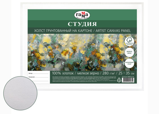 Холст выполнен из 100% хлопка, обладает мелкозернистой текстурой, что делает его универсальным для различных работ, от объёмных абстракций до детализированных композиций. Холст покрыт несколькими слоями грунта и полностью готов к работе. Плотность 280 гр/м2. Может использоваться для живописи масляными, акриловыми или темперными красками. Линейка представлена холстами на картоне в различных форматах.