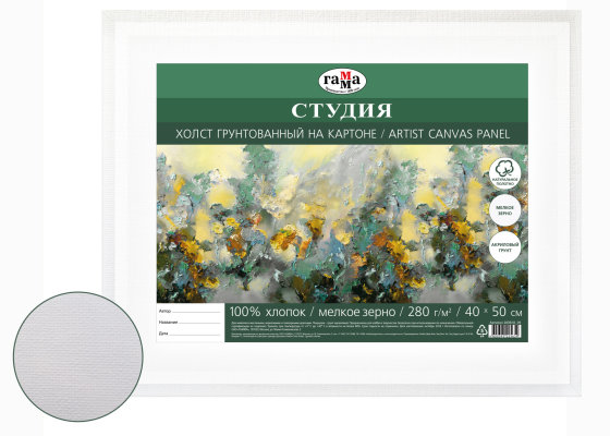 Холст выполнен из 100% хлопка, обладает мелкозернистой текстурой, что делает его универсальным для различных работ, от объёмных абстракций до детализированных композиций. Холст покрыт несколькими слоями грунта и полностью готов к работе. Плотность 280 гр/м2. Может использоваться для живописи масляными, акриловыми или темперными красками. Линейка представлена холстами на картоне в различных форматах.