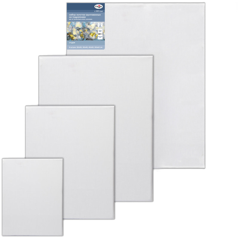 Набор хлопковых холстов на подрамнике ГАММА серии «Студия» грунтованных, подойдёт для живописи масляными, акриловыми, темперными и гуашевыми красками. Основа – натуральное полотно, 100% хлопок, мелкое зерно. Холсты прямоугольной формы плотностью 280 г/м2. В наборе 4 размера – 20*30, 30*40, 40*50, 50*60 см. Холсты покрыты акриловым грунтом, а подрамники выполнены из сосны. Изготовлены без использования кислот. Подходят студентам художественных школ и училищ, начинающим и профессиональным художникам.