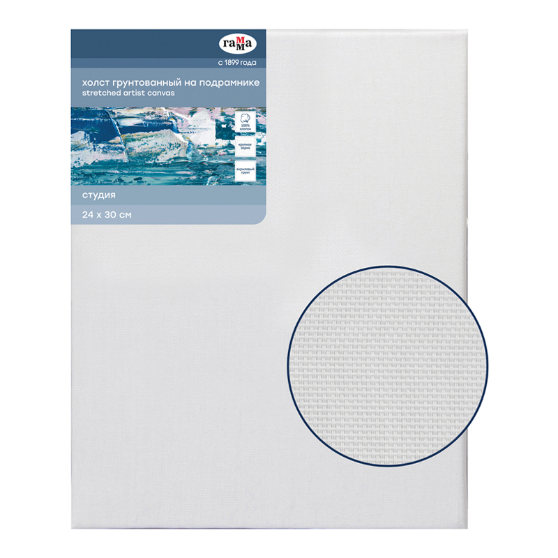 Холст изготовлен из хлопкового волокна и обладает крупнозернистой фактурой. Холст покрыт несколькими слоями акрила и натянут на подрамник, это полностью готовая основа для работ масляными, акриловыми и темперными красками. Высокий показатель плотности 400 гр/м2 обеспечивает возможность работы в пастозной и многослойной технике.