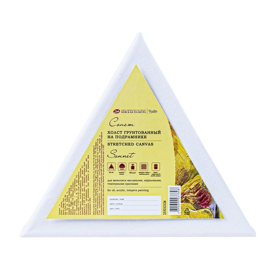 Холст на подрамнике "Сонет" необычной форму состоит из 100% хлопка плотностью 280 г/м2 и имеет 3 слоя акрилового грунта. Зерно холста - среднее. Холст на подрамнике используют для живописи масляными, акриловыми, темперными красками при создании пейзажей, натюрмортов, портретов нестандартных форм. Разнообразные формы холстов интересны также в смешанной технике, для декупажа и кракелюра, технике жидкого акрила («флюид арт»). Их часто используют при оформлении интерьера по несколько холстов одной или разных форм.