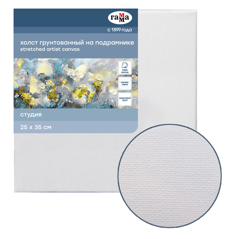 Холст изготовлен из хлопка, обладает мелкозернистой фактурой, что обеспечивает возможность прорисовки точных деталей в работе. Холст покрыт несколькими слоями акрилового слоя, что обеспечивает идеальную адгезию с красочным слоем и делает рабочую поверхность полностью готовой к работе. Холст предназначен для живописных работ акриловыми, масляными и темперными красками.