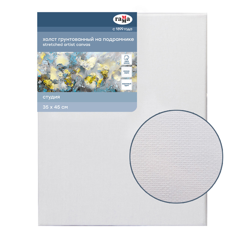 Холст изготовлен из хлопка, обладает мелкозернистой фактурой, что обеспечивает возможность прорисовки точных деталей в работе. Холст покрыт несколькими слоями акрилового слоя, что обеспечивает идеальную адгезию с красочным слоем и делает рабочую поверхность полностью готовой к работе. Холст предназначен для живописных работ акриловыми, масляными и темперными красками.