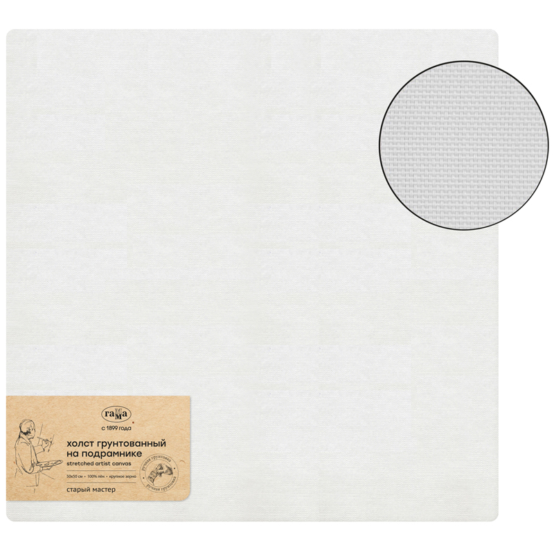 Холсты «ГАММА» с ручной грунтовкой натягиваются и грунтуются вручную. По традиционной технологии высококачественное 100% льняное полотно натягивают на сосновый подрамник с буртиком. Перед грунтовкой ткань проходит специальную обработку и проверку, для обеспечения ровной поверхности готового холста. Наши мастера сначала проклеивают каждый подрамник с натянутым полотном тремя слоями желатиновой проклейки и затем грунтуют тремя слоями масляно-эмульсионного грунта. Холсты прекрасно подходят для работ акриловыми и масляными красками. Массивный модульный подрамник, шириной 4 см, изготовлен из российской сосны, клинья для натяжки холста в комплекте. Холст упругий, не провисает после нанесения красок даже в несколько слоёв.