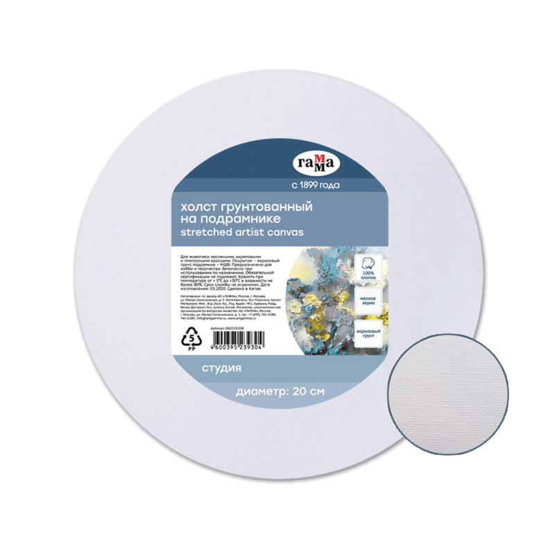 Хлопковый холст на подрамнике ГАММА серии «Студия», круглый и грунтованный, подойдёт для живописи масляными, акриловыми, темперными и гуашевыми красками. Основа – натуральное полотно, 100% хлопок, мелкое зерно. Холст круглой формы плотностью 280 г/м2. Холст покрыт акриловым грунтом, а подрамник выполнен из МДФ. Изготовлен без использования кислот. Подходит студентам художественных школ и училищ, начинающим и профессиональным художникам. • плотность 280 г/м?; • мелкое зерно; • 100% хлопок; • акриловый трёхслойный грунт; • подрамник из МДФ