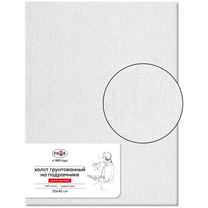 Холсты «ГАММА» с ручной грунтовкой натягиваются и грунтуются вручную. По традиционной технологии высококачественное 100% хлопковое полотно натягивают на сосновый подрамник с буртиком. Перед грунтовкой ткань проходит специальную обработку и проверку, для обеспечения ровной поверхности готового холста. Наши мастера сначала проклеивают каждый подрамник с натянутым полотном тремя слоями желатиновой проклейки и затем грунтуют тремя слоями масляно-эмульсионного грунта. Холсты прекрасно подходят для работ акриловыми и масляными красками. Массивный модульный подрамник, шириной 5 см, изготовлен из российской сосны, клинья для натяжки холста в комплекте. Холст упругий, не провисает после нанесения красок даже в несколько слоёв.
