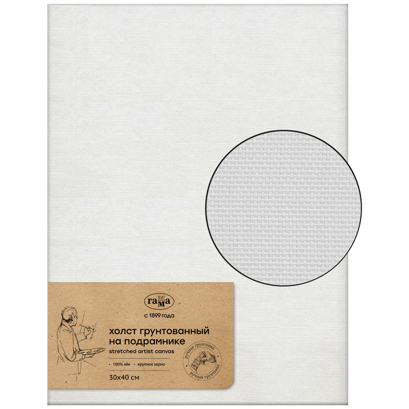 Холсты «ГАММА» с ручной грунтовкой натягиваются и грунтуются вручную. По традиционной технологии высококачественное 100% льняное полотно натягивают на сосновый подрамник с буртиком. Перед грунтовкой ткань проходит специальную обработку и проверку, для обеспечения ровной поверхности готового холста. Наши мастера сначала проклеивают каждый подрамник с натянутым полотном тремя слоями желатиновой проклейки и затем грунтуют тремя слоями масляно-эмульсионного грунта. Холсты прекрасно подходят для работ акриловыми и масляными красками. Массивный модульный подрамник, шириной 4 см, изготовлен из российской сосны, клинья для натяжки холста в комплекте. Холст упругий, не провисает после нанесения красок даже в несколько слоёв.