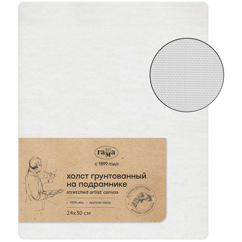 Холсты «ГАММА» с ручной грунтовкой натягиваются и грунтуются вручную. По традиционной технологии высококачественное 100% льняное полотно натягивают на сосновый подрамник с буртиком. Перед грунтовкой ткань проходит специальную обработку и проверку, для обеспечения ровной поверхности готового холста. Наши мастера сначала проклеивают каждый подрамник с натянутым полотном тремя слоями желатиновой проклейки и затем грунтуют тремя слоями масляно-эмульсионного грунта. Холсты прекрасно подходят для работ акриловыми и масляными красками. Массивный модульный подрамник, шириной 4 см, изготовлен из российской сосны, клинья для натяжки холста в комплекте. Холст упругий, не провисает после нанесения красок даже в несколько слоёв.