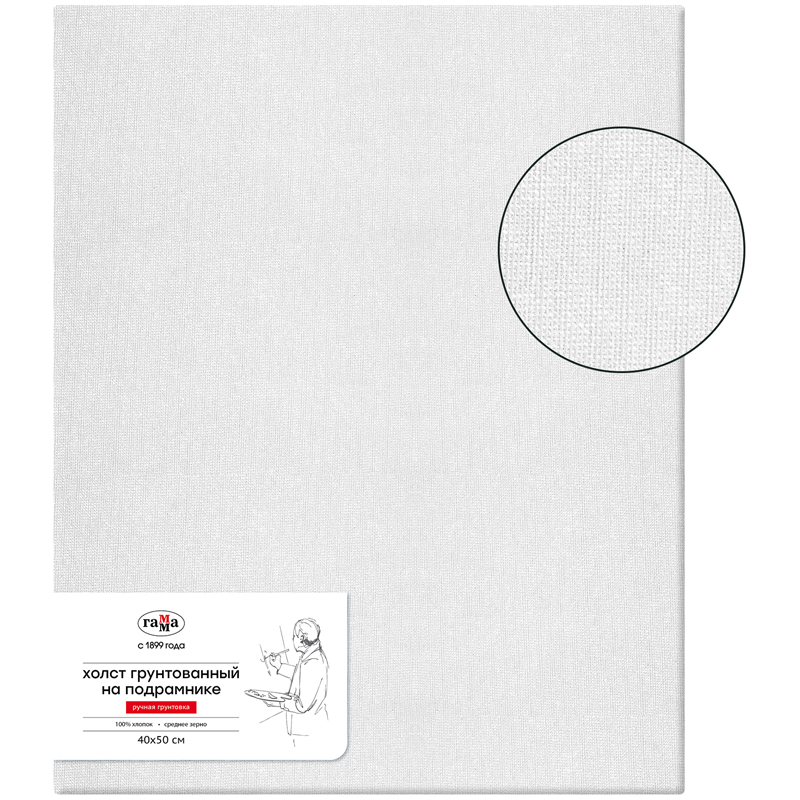 Холсты «ГАММА» с ручной грунтовкой натягиваются и грунтуются вручную. По традиционной технологии высококачественное 100% хлопковое полотно натягивают на сосновый подрамник с буртиком. Перед грунтовкой ткань проходит специальную обработку и проверку, для обеспечения ровной поверхности готового холста. Наши мастера сначала проклеивают каждый подрамник с натянутым полотном тремя слоями желатиновой проклейки и затем грунтуют тремя слоями масляно-эмульсионного грунта. Холсты прекрасно подходят для работ акриловыми и масляными красками. Массивный модульный подрамник, шириной 5 см, изготовлен из российской сосны, клинья для натяжки холста в комплекте. Холст упругий, не провисает после нанесения красок даже в несколько слоёв.
